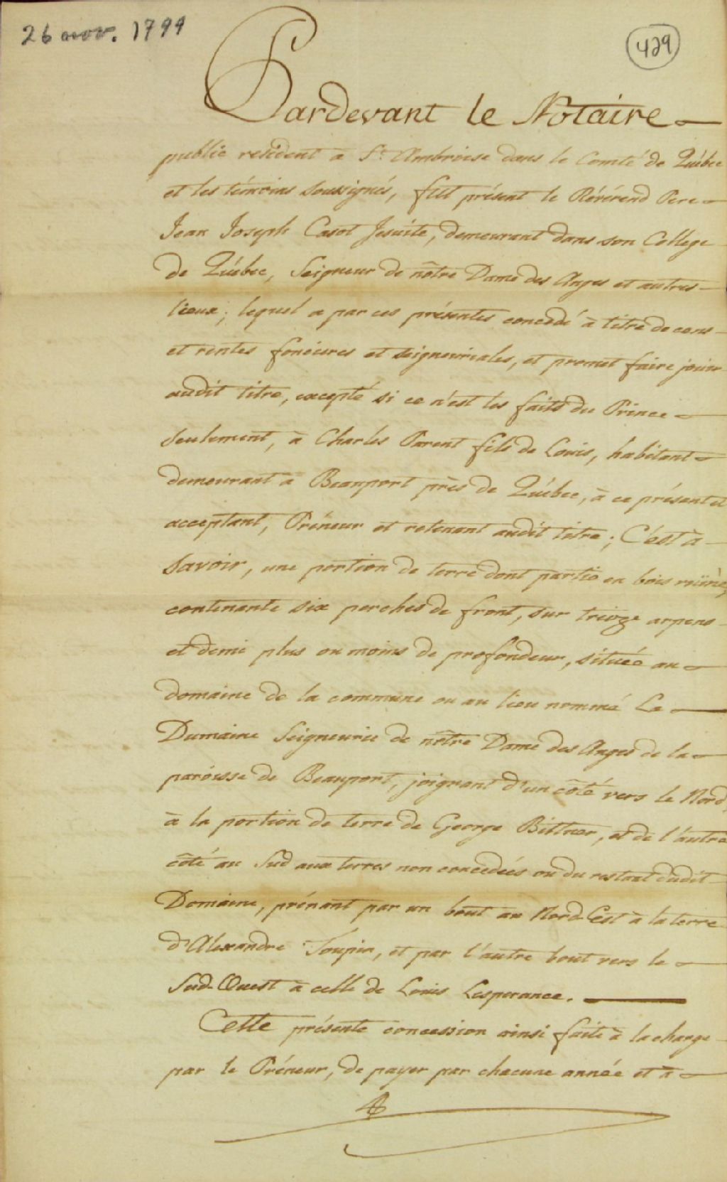 Acte de concession d'une portion de terre située au domaine de la Commune ou au lieu nommé la Dumaine en la paroisse de Beauport en la seigneurie de Notre-Dame-des-Anges par le Révérend Père Jean-Joseph Casot, Jésuite, demeurant dans son collège de Québec, seigneur de ladite seigneurie et autres lieux, à Charles Parent, fils de Louis Parent, habitant demeurant à Beauport près de Québec, par-devant Jean-Baptiste Panet, notaire public, 26 novembre 1799, Archives nationales à Québec, Fonds Ministère des Terres et Forêts, (03Q,E21,S64,SS5,SSS5,D429).