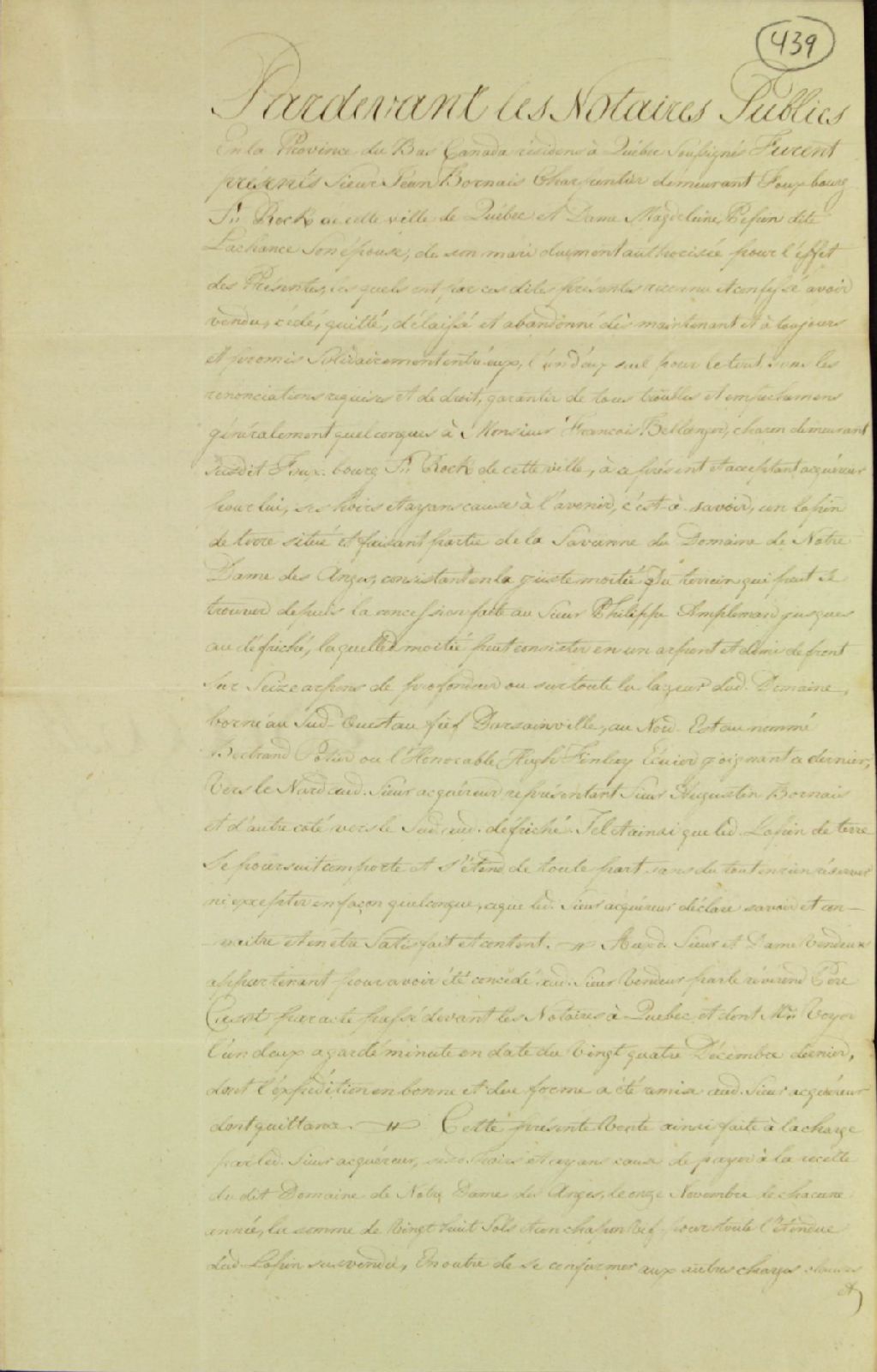 Contrat de vente d'un lopin de terre situé dans la Savane du domaine de Notre-Dame-des-Anges par le sieur Jean Bornais, charpentier, demeurant au faubourg Saint-Roch à Québec, et dame Madeleine Pepin dit Lachance, son épouse, à monsieur François Bélanger (fils?), charron [fabricant de chars, charrettes, brouettes, etc. ], demeurant audit faubourg Saint-Roch, par-devant les notaires publics, 7 mars 1800, Archives nationales à Québec, Fonds Ministère des Terres et Forêts, (03Q,E21,S64,SS5,SSS5,D439).