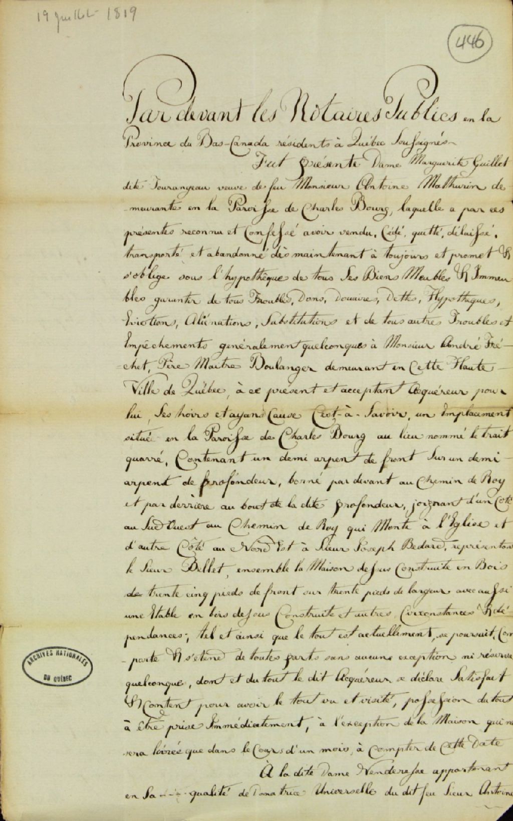 Contrat de vente d'un emplacement situé en la paroisse de Charlesbourg au lieu nommé le trait-carré par dame Marguerite Guillet dit Tourangeau, veuve de monsieur Antoine Mathurin, demeurant en ladite paroisse, à monsieur André Fréchet père, maître boulanger, demeurant en la Haute-Ville de Québec, par-devant les notaires publics, 19 juillet 1819, Archives nationales à Québec, Fonds Ministère des Terres et Forêts, (03Q,E21,S64,SS5,SSS5,D446).