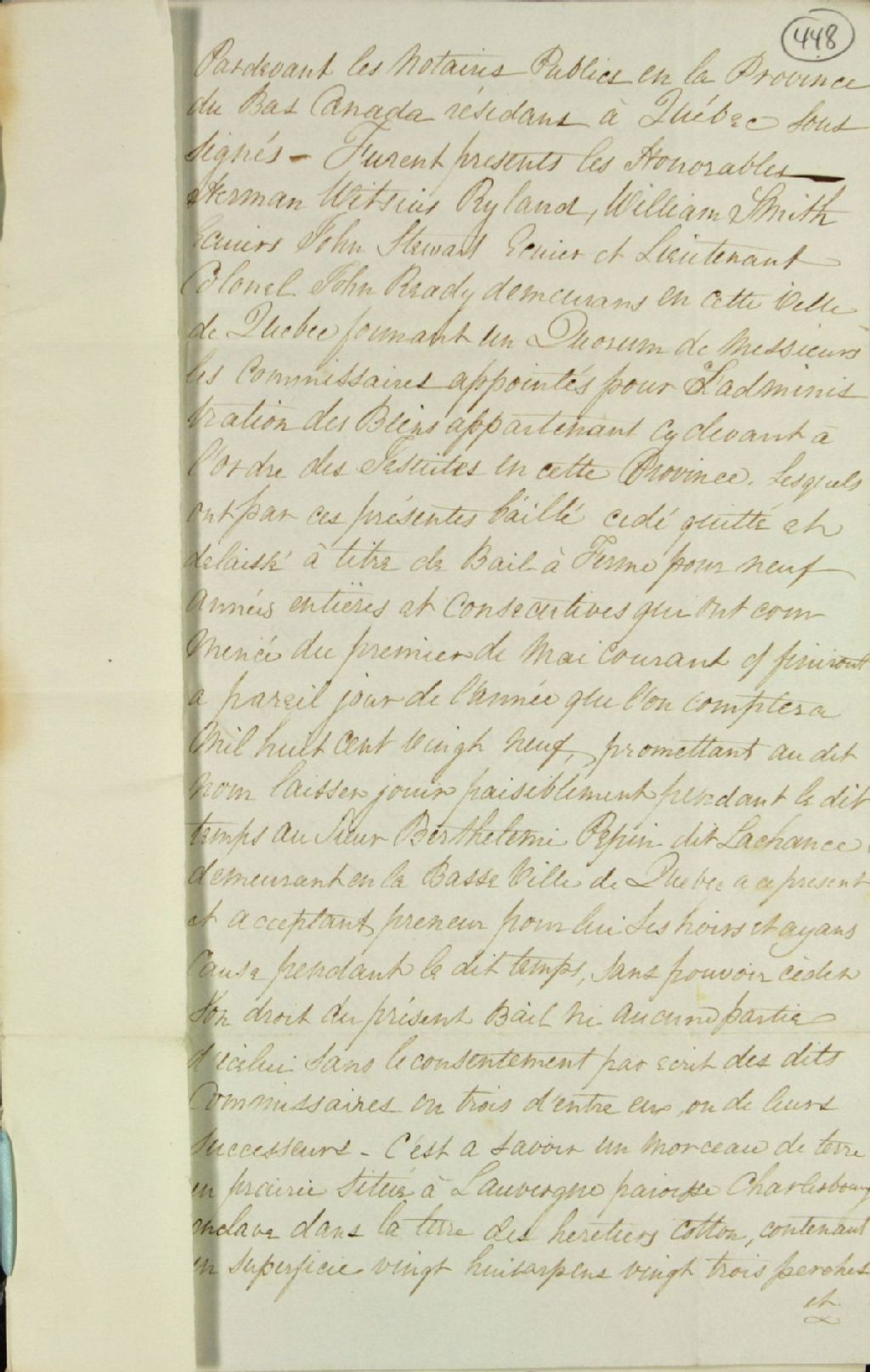 Bail à ferme d'un morceau de terre en prairie situé à l'Auvergne en la paroisse de Charlesbourg enclavé dans la terre des héritiers Coton par les Honorables Herman Witsius Ryland, William Smith, écuyers, John Stewart, écuyer et lieutenant colonel, et John Brady, demeurant en la ville de Québec, formant un quorum de messieurs les commissaires responsables de l'administration des biens appartenant ci-devant à l'ordre des Jésuites en la province du Bas-Canada, au sieur Barthélemi Pepin dit Lachance, demeurant en la Basse-Ville de Québec, pour neuf années entières et consécutives