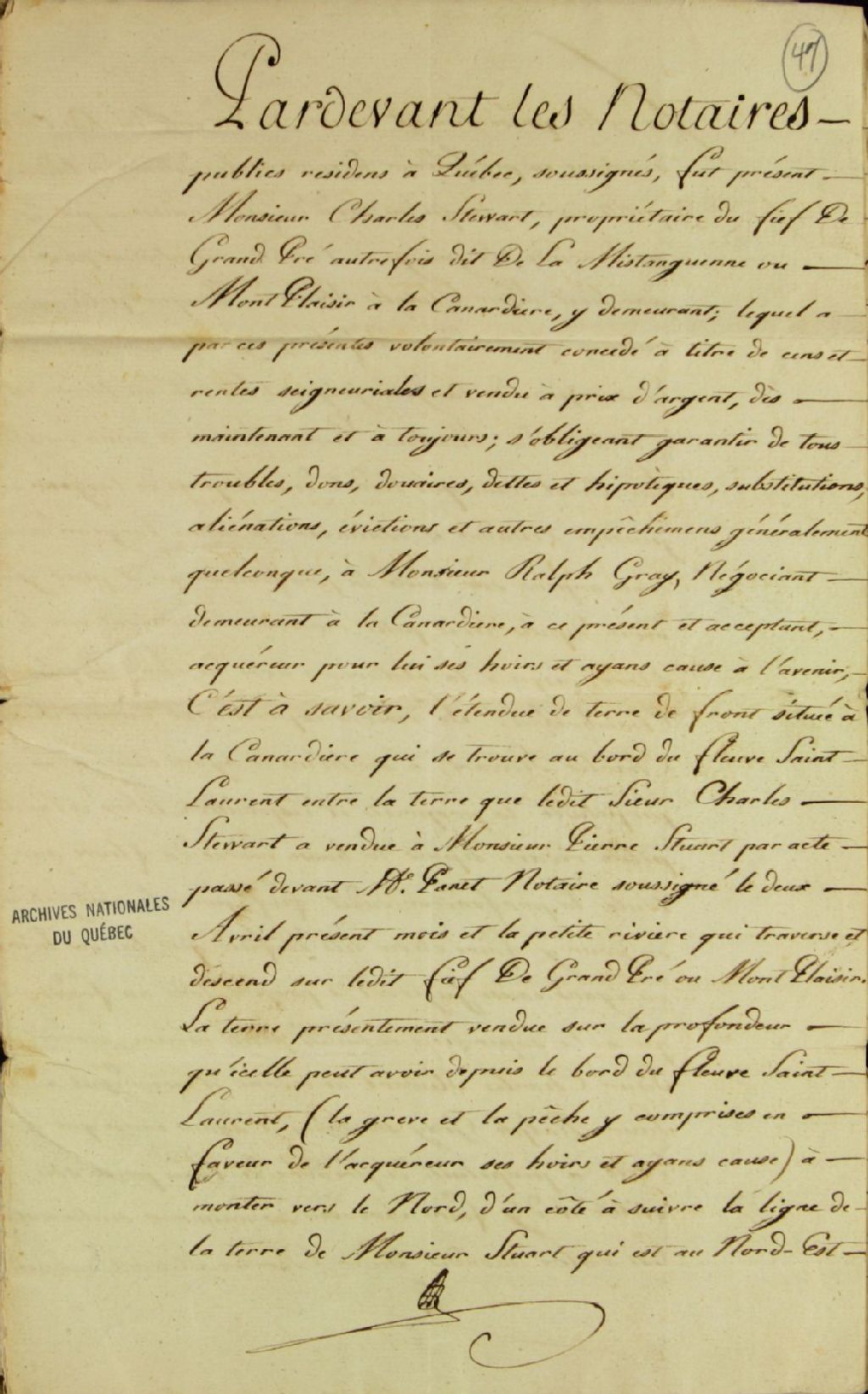 Contrat de vente du fief de Grandpré, autrefois dit De la Mistanguienne ou Montplaisir, à la Canardière, par monsieur Charles Stewart à monsieur Ralph Gray, négociant demeurant à la Canardière, moyennant la somme de deux cent soixante-quatre livres en monnaie actuelle de Québec égale au cours d'Halifax que le sieur Gray a payée par déduction faite sur un compte de cinq cents livres sterling que ledit sieur Stewart devait lui payer