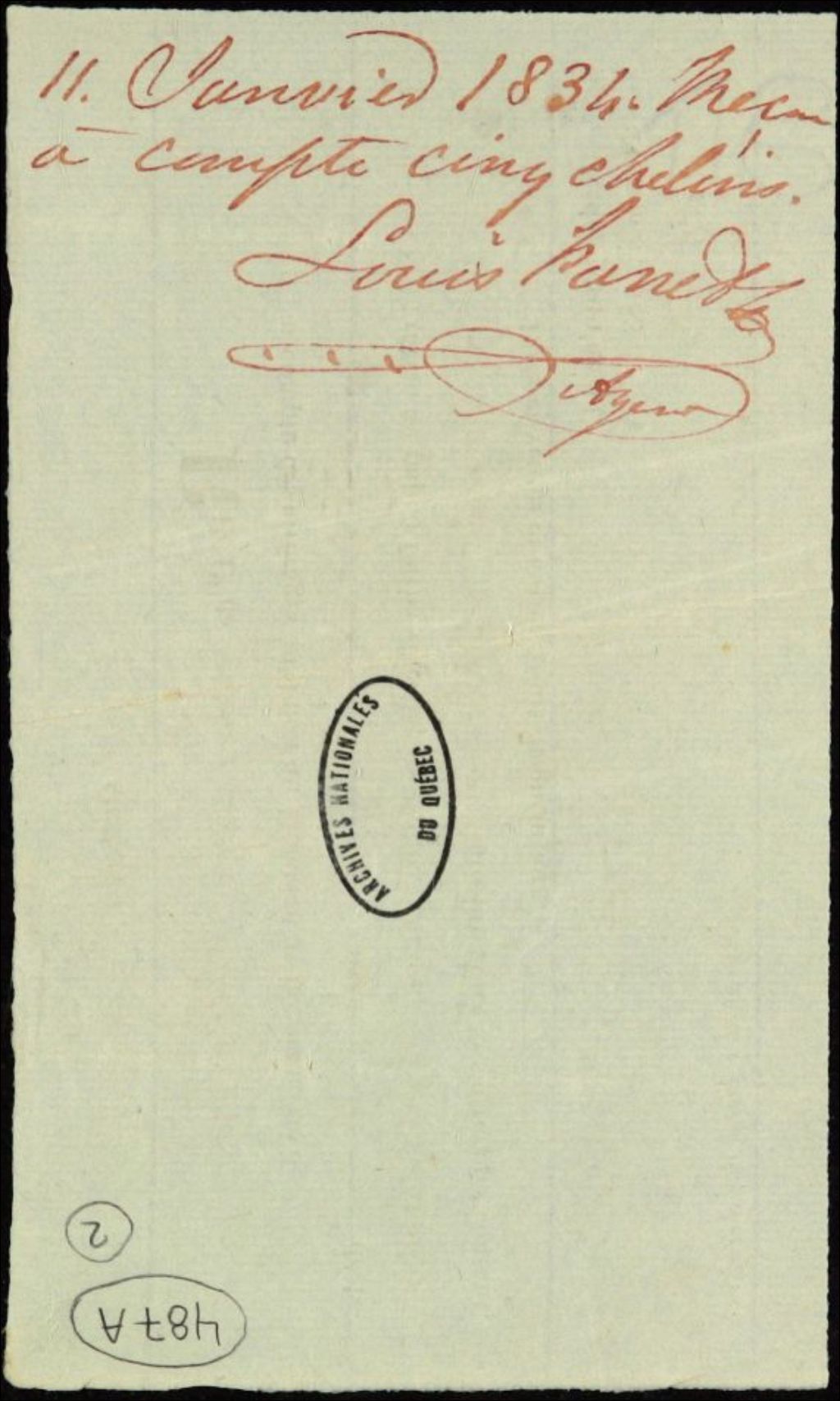 Déclaration de Louis Panet à l'effet qu'il a reçu [de Laurent Bédard] un acompte de cinq shillings
