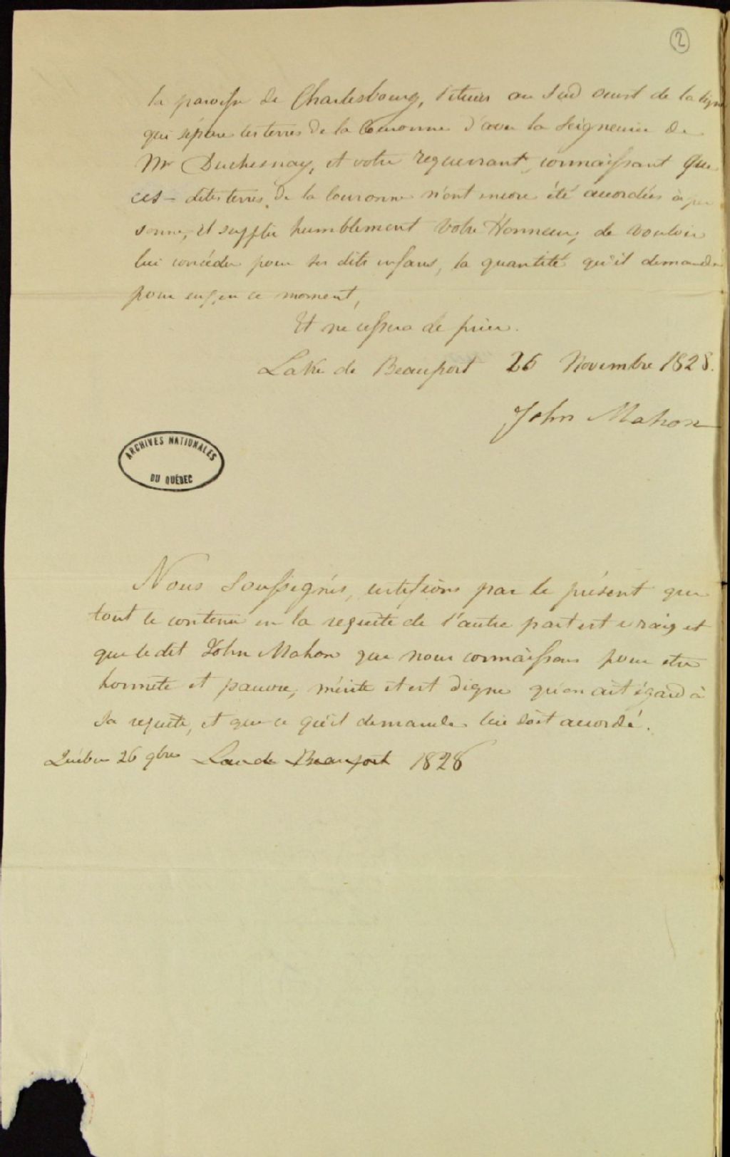 Attestation de Morrison (?), qui certifie que tout ce qui est mentionné en la requête de John Mahon est vrai et que ledit Mahon est un homme honnête et pauvre qui mérite qu'on accède à sa demande