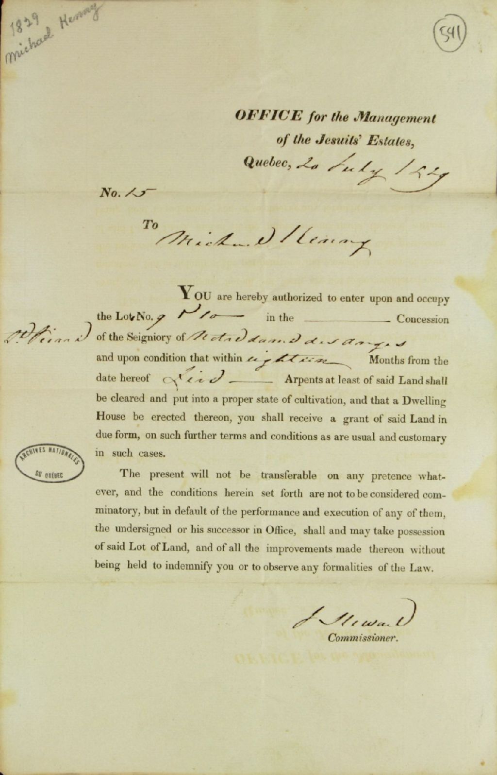 Billet de concession des lots numéro neuf et numéro dix dans la concession de Saint-Pierre de la seigneurie de Notre-Dame-des-Anges par John Stewart, commissaire responsable de la gestion des biens ayant appartenu à l'ordre des Jésuites, à Michael Kenny, avec l'obligation pour ledit Kenny d'avoir défriché au moins cinq arpents de ladite terre dans dix-huit mois et d'y avoir construit une maison, 20 juillet 1829, Archives nationales à Québec, Fonds Ministère des Terres et Forêts, (03Q,E21,S64,SS5,SSS5,D541).