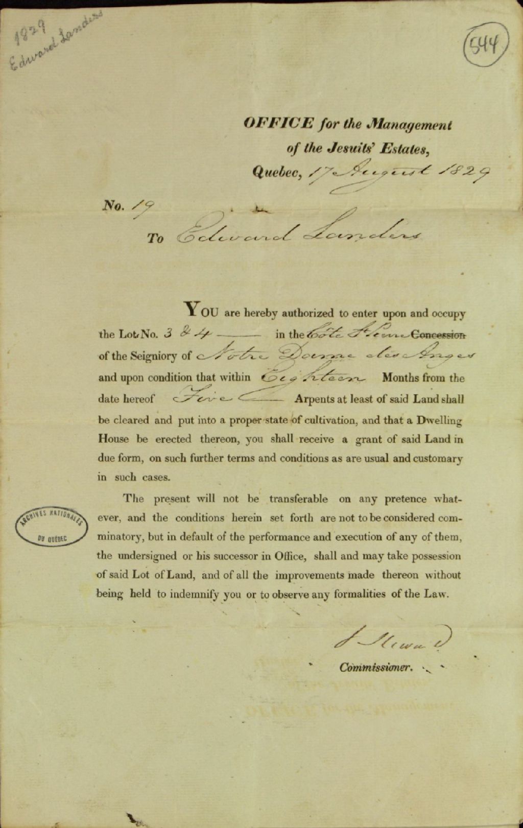 Billet de concession des lots numéro trois et numéro quatre dans la côte Saint-Pierre en la seigneurie de Notre-Dame-des-Anges par John Stewart, commissaire responsable de la gestion des biens ayant appartenu à l'ordre des Jésuites, à Edward Landers, avec l'obligation pour ledit Landers d'avoir défriché au moins cinq arpents de ladite terre dans dix-huit mois et d'y avoir construit une maison, 17 août 1829, Archives nationales à Québec, Fonds Ministère des Terres et Forêts, (03Q,E21,S64,SS5,SSS5,D544).