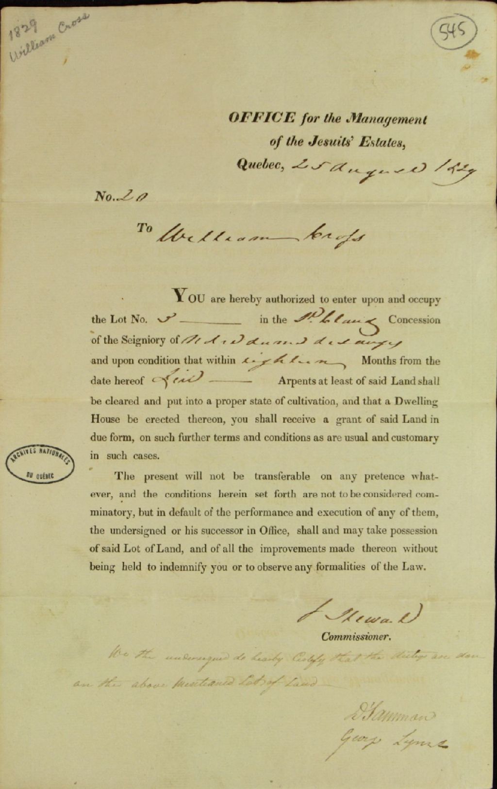 Billet de concession du lot numéro trois dans la concession de Saint-Claude en la seigneurie de Notre-Dame-des-Anges par John Stewart, commissaire responsable de la gestion des biens ayant appartenu à l'ordre des Jésuites, à William Cross, avec l'obligation pour ledit Cross d'avoir défriché au moins cinq arpents de ladite terre dans dix-huit mois et d'y avoir construit une maison, 25 août 1829, Archives nationales à Québec, Fonds Ministère des Terres et Forêts, (03Q,E21,S64,SS5,SSS5,D545).
