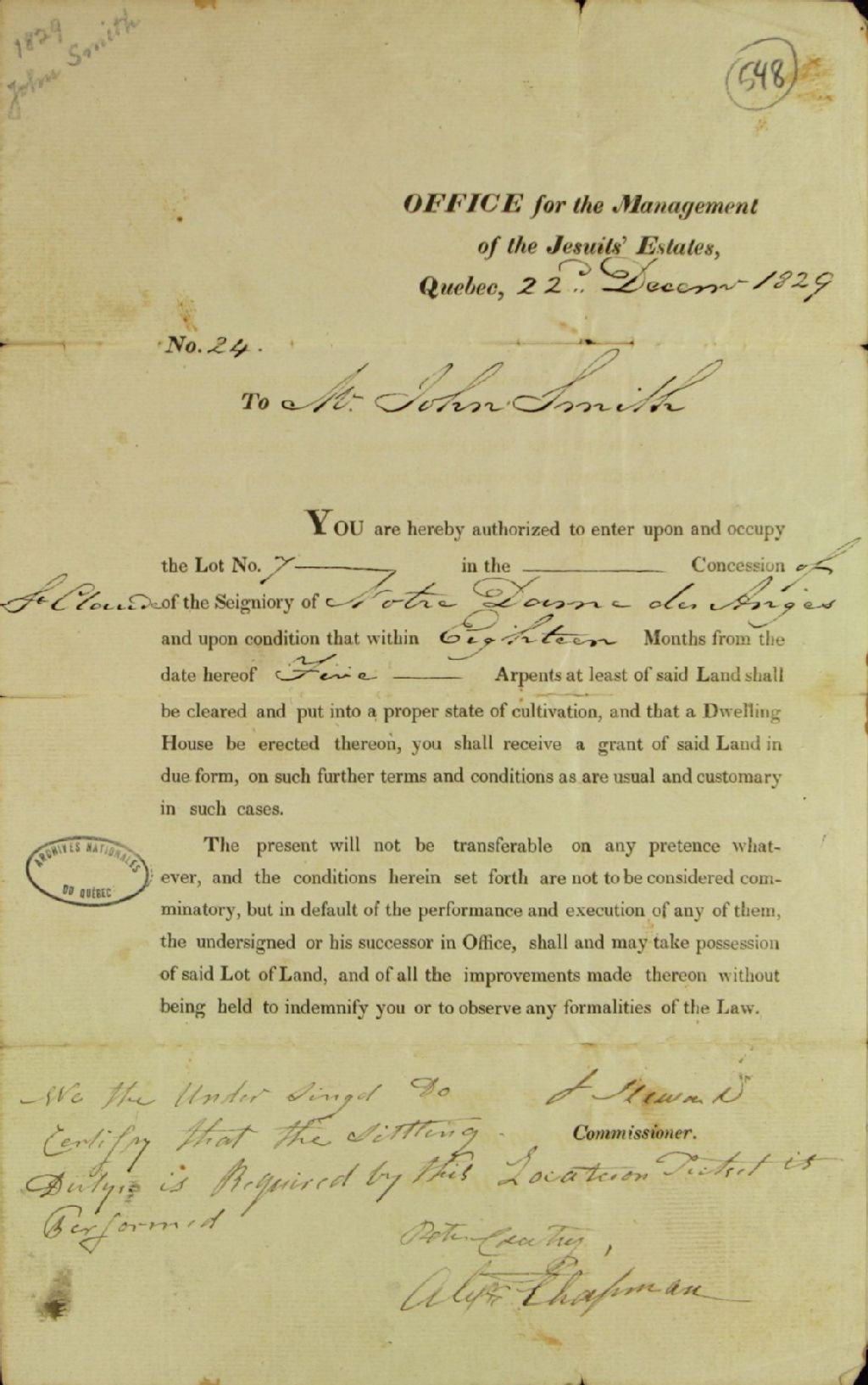 Billet de concession du lot numéro sept dans la concession de Saint-Claude en la seigneurie de Notre-Dame-des-Anges par John Stewart, commissaire responsable de la gestion des biens ayant appartenu à l'ordre des Jésuites, à monsieur John Smith, avec l'obligation pour ledit Smith d'avoir défriché au moins cinq arpents de ladite terre dans dix-huit mois et d'y avoir construit une maison, 22 décembre 1829, Archives nationales à Québec, Fonds Ministère des Terres et Forêts, (03Q,E21,S64,SS5,SSS5,D548).