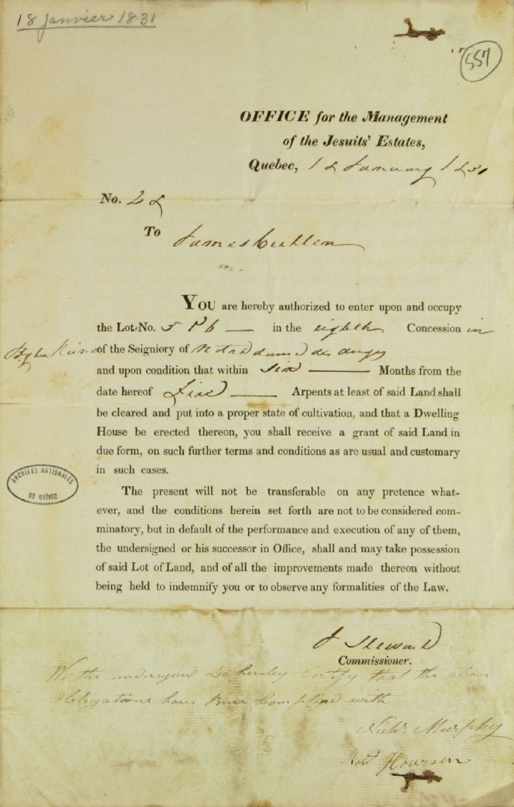 Billet de concession des lots numéro cinq et numéro six dans la huitième concession du Bourg-la-Reine en la seigneurie de Notre-Dame-des-Anges par John Stewart, commissaire responsable de la gestion des biens ayant appartenu à l'ordre des Jésuites, à James Cullen, avec l'obligation pour ledit Cullen d'avoir défriché au moins cinq arpents de ladite terre dans six mois et d'y avoir construit une maison, 18 janvier 1830, Archives nationales à Québec, Fonds Ministère des Terres et Forêts, (03Q,E21,S64,SS5,SSS5,D557).