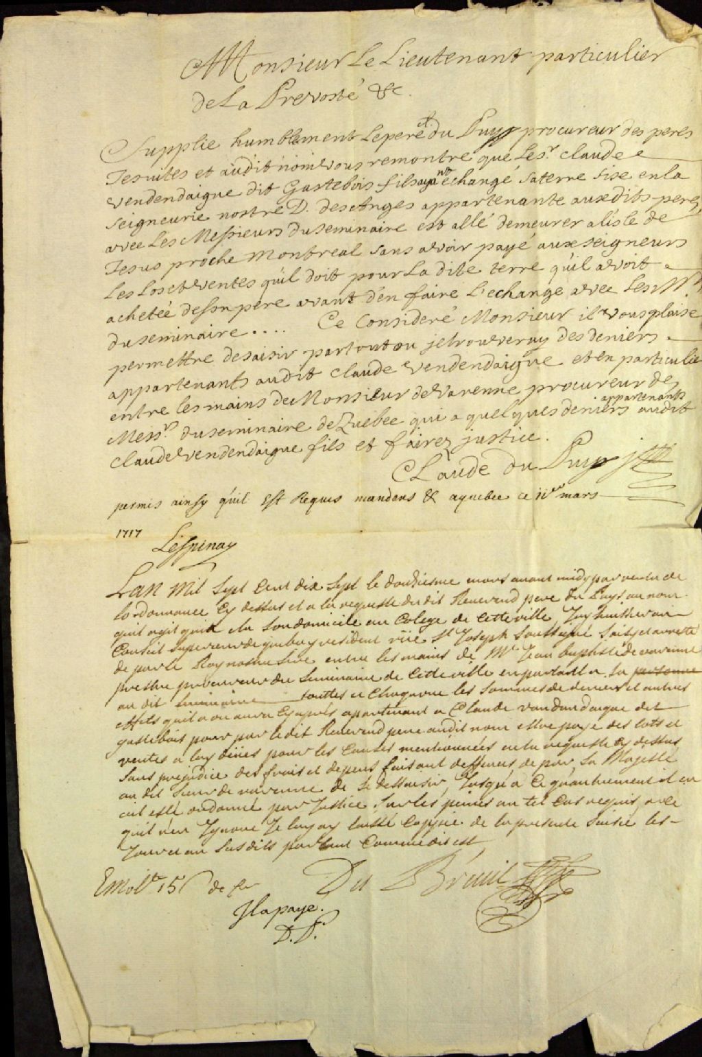 Requête du Révérend Père Dupuis, procureur des Révérends Pères Jésuites, faisant audit nom, à monsieur le lieutenant particulier de la Prévôté de Québec, ledit Révérend Père faisant valoir que le sieur Claude Vandandaigue dit Gatebois (Gadbois) fils a échangé sa terre sise en la seigneurie de Notre-Dame-des-Anges appartenant auxdits Révérends Pères aux messieurs du Séminaire et est allé demeurer à l'Île-Jésus, près de Montréal, sans avoir payé aux seigneurs les lods et ventes de ladite terre, et demandant la permission de saisir les deniers dus partout où il les trouvera, et particulièrement entre les mains de monsieur de Varennes, procureur des messieurs du Séminaire de Québec