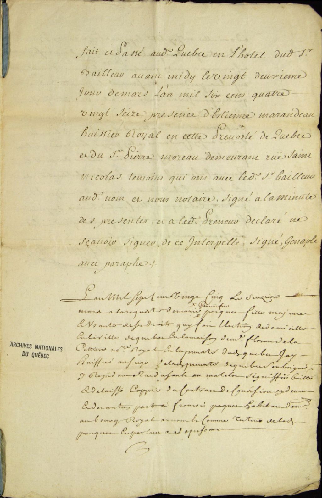 Déclaration du huissier Desaline (de Saline) à l'effet qu'il a remis, à la requête de Marie-Geneviève (Marie-Madeleine) Paquet, fille majeure jouissant de ses droits demeurant à Québec en la maison de Florent de la Cetière (LaCetière), une copie du contrat relatif à la concession de Louis Paquet (Pasquier) à François Paquet, habitant du Bourg-Royal, au nom et comme tuteur de ladite Paquet, ainsi qu'une assignation à comparaître le mardi suivant à neuf heures du matin au palais, par-devant les messieurs de la Prévôté de Québec, pour se voir condamner à remettre à ladite Paquet la part de terre qui lui revient conformément audit contrat, 16 mars 1725, Archives nationales à Québec, Fonds Ministère des Terres et Forêts, (03Q,E21,S64,SS5,SSS5,D58-2).