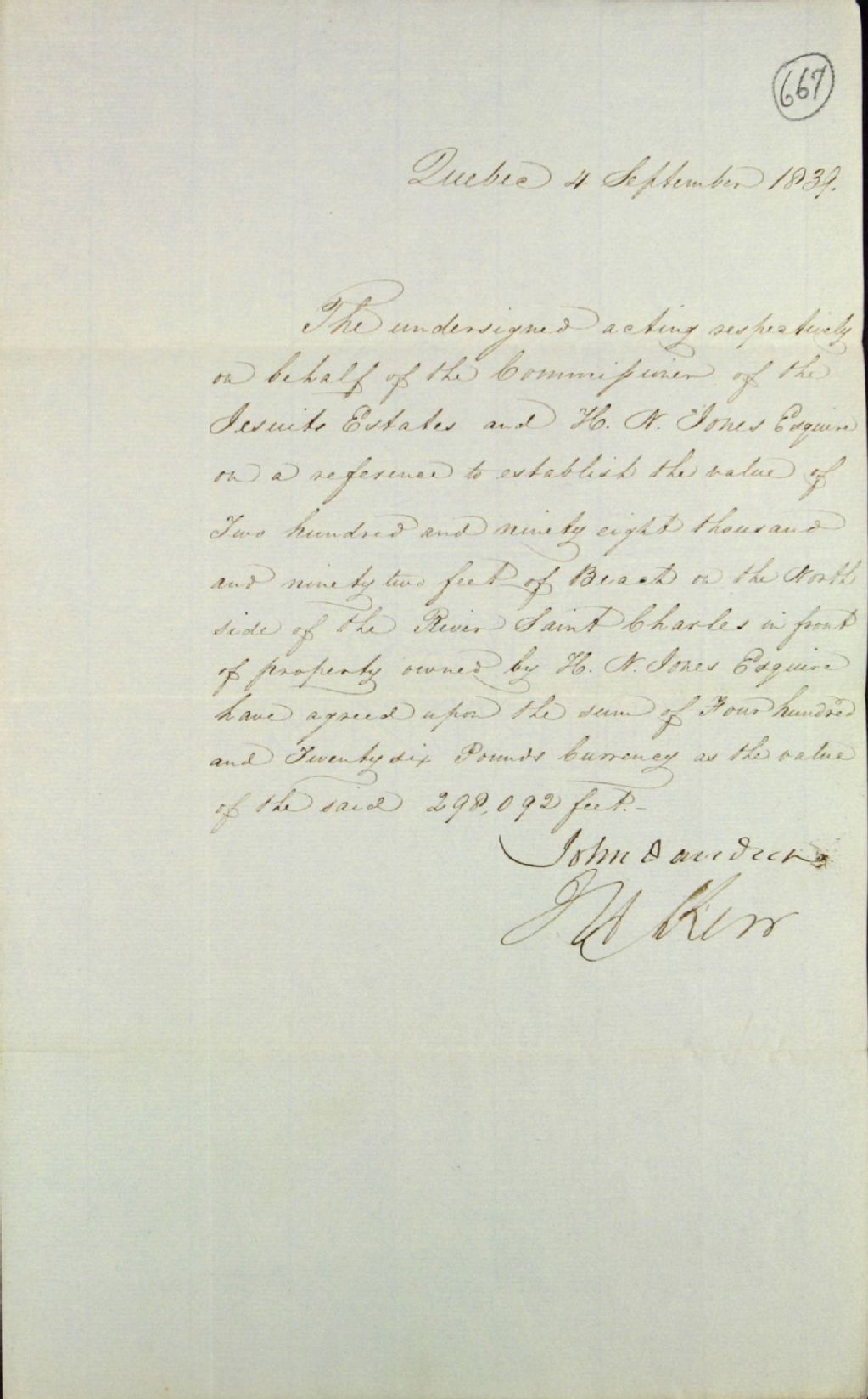Estimation à quatre cent vingt-six livres par John Davidson et James N. Kerr, agissant respectivement au nom du commissaire chargé de l'administration des biens des Jésuites et au nom de H. N. Jones, écuyer, de la valeur de la grève située au nord de la rivière Saint-Charles devant la propriété dudit Jones, 4 septembre 1839, Archives nationales à Québec, Fonds Ministère des Terres et Forêts, (03Q,E21,S64,SS5,SSS5,D667).