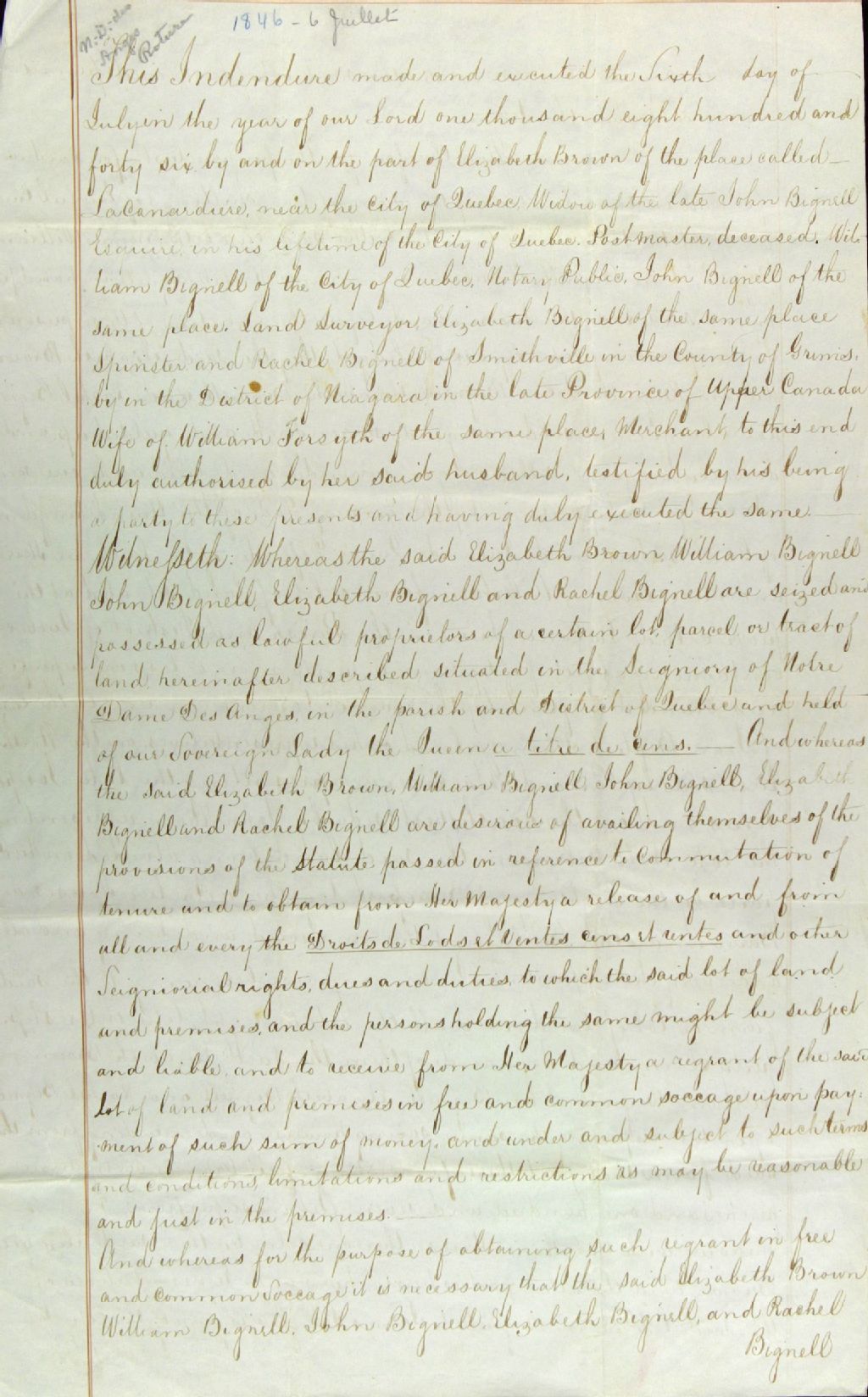 Abandon d'un lot de terre situé à la Canardière en la paroisse et district de Québec par Elizabeth Brown, de la Canardière, veuve de John Bignell, écuyer, de son vivant maître de postes, William Bignell, de la ville de Québec, notaire public, John Bignell, du même lieu, arpenteur, Elizabeth Bignell, du même lieu, fille majeure, et Rachel Bignell, de Smithville dans le comté de Grimsby dans le district de Niagara, femme de William Forsyth, marchand, au profit de la Souveraine Dame Victoria, Reine par la grâce de Dieu du Royaume-Uni de Grande-Bretagne et d'Irlande, défenseur de la Foi, lesdits Brown et Bignell souhaitant obtenir la commutation de la tenure seigneuriale en celle de franc et commun socage dudit lot de terre, mais devant d'abord abandonner ladite terre à ladite Souveraine Dame