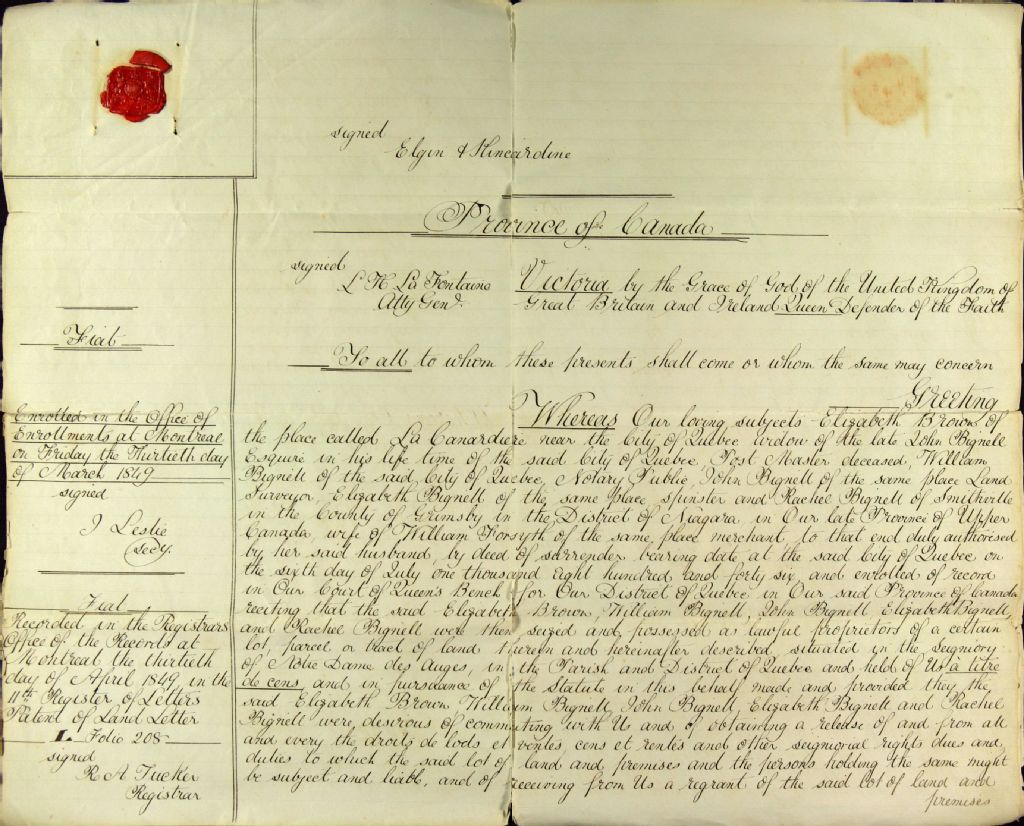 Lettres patentes par lesquelles Sa Majesté Victoria, Reine par la grâce de Dieu du Royaume-Uni de Grande-Bretagne et d'Irlande, défenseur de la Foi, concède en franc et commun socage [commutation] une terre située à la Canardière en la seigneurie de Notre-Dame-des-Anges, divisée en deux lots par la route de la Reine menant à Beauport, à Elizabeth Brown, de la Canardière, veuve de John Bignell, écuyer, maître de postes, William Bignell, de la ville de Québec, notaire public, John Bignell, du même lieu, arpenteur, Elizabeth Bignell, du même lieu, fille majeure, et Rachel Bignell, de Smithville dans le comté de Grimsby dans le district de Niagara, femme de William Forsyth, marchand