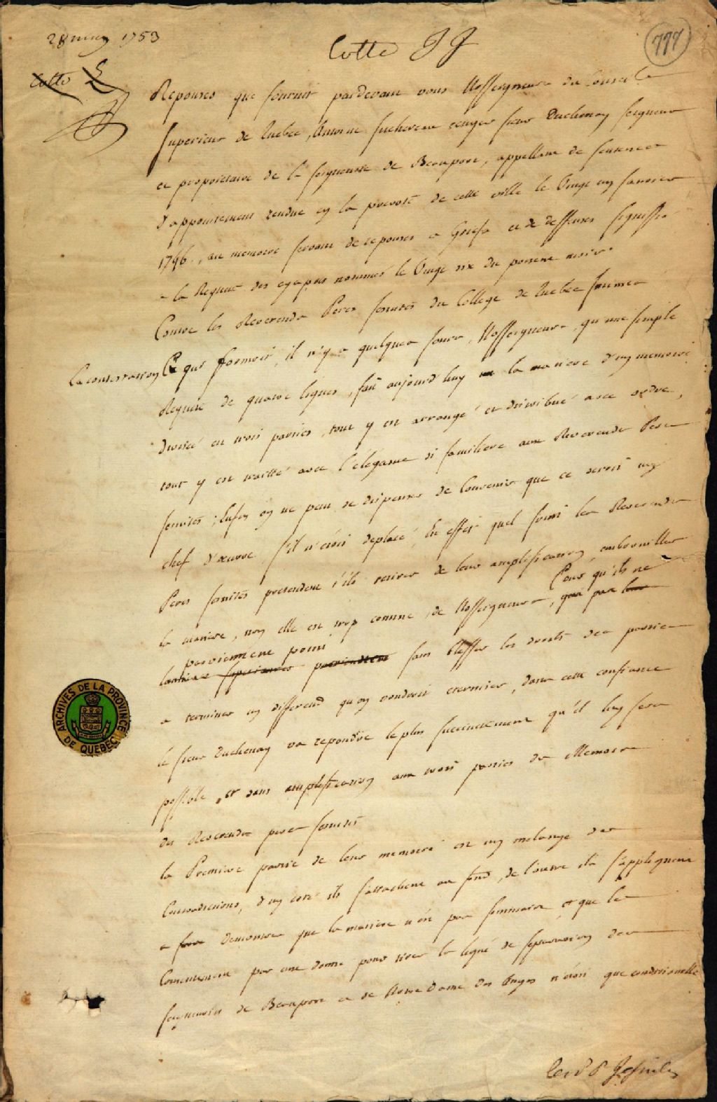 Réponses que fournit Antoine Juchereau Duchesnay, écuyer, seigneur et propriétaire de la seigneurie de Beauport, appelant de la sentence rendue en la Prévôté de Québec le 21 janvier 1746, par-devant les seigneurs du Conseil supérieur de Québec, dans la cause opposant ledit sieur Duchesnay aux Révérends Pères Jésuites du collège de Québec