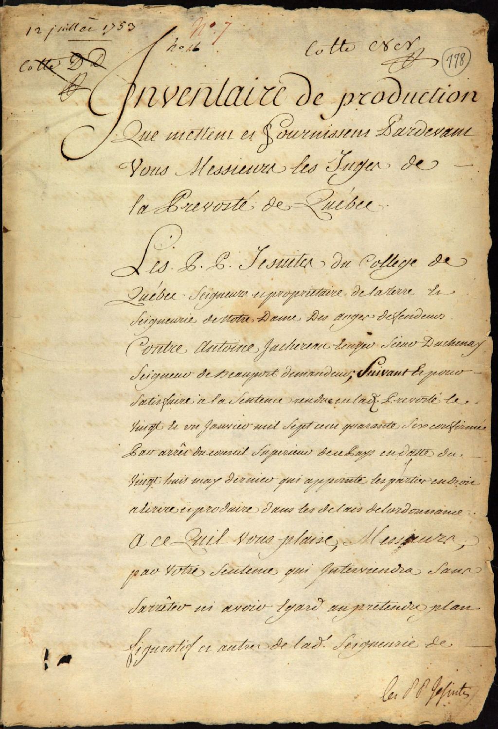 Inventaire de production [inventaire des pièces produites au cours d'un procès] que les Révérends Pères Jésuites du collège de Québec, seigneurs et propriétaires de la seigneurie de Notre-Dame-des-Anges, défendeurs, fournissent à messieurs les juges de la Prévôté de Québec, dans la cause les opposant à Antoine Juchereau Duchesnay, écuyer, seigneur de Beauport, demandeur, suivant et pour satisfaire à la sentence rendue en la Prévôté le 21 janvier 1746, confirmée par arrêt du Conseil supérieur le 28 mai 1753