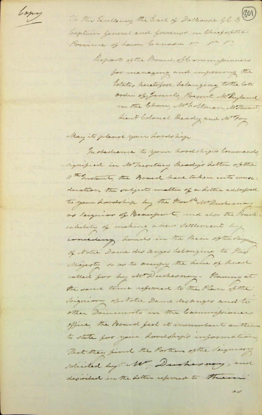 Rapport de Hermann W. Ryland, au nom des commissaires responsables de l'administration des biens des Jésuites, à George Ramsay, 9e comte de Dalhousie, gouverneur en chef de l'Amérique du Nord britannique concernant la demande de L. A. Duchesnay de créer une route reliant l'arrière des seigneuries Notre-Dame-des-Anges, propriété des Jésuites, et de Beauport, propriété de Duchesnay, ainsi que de la faisabilité d'ouvrir l'arrière de la seigneurie Notre-Dame-des-Anges à la colonisation