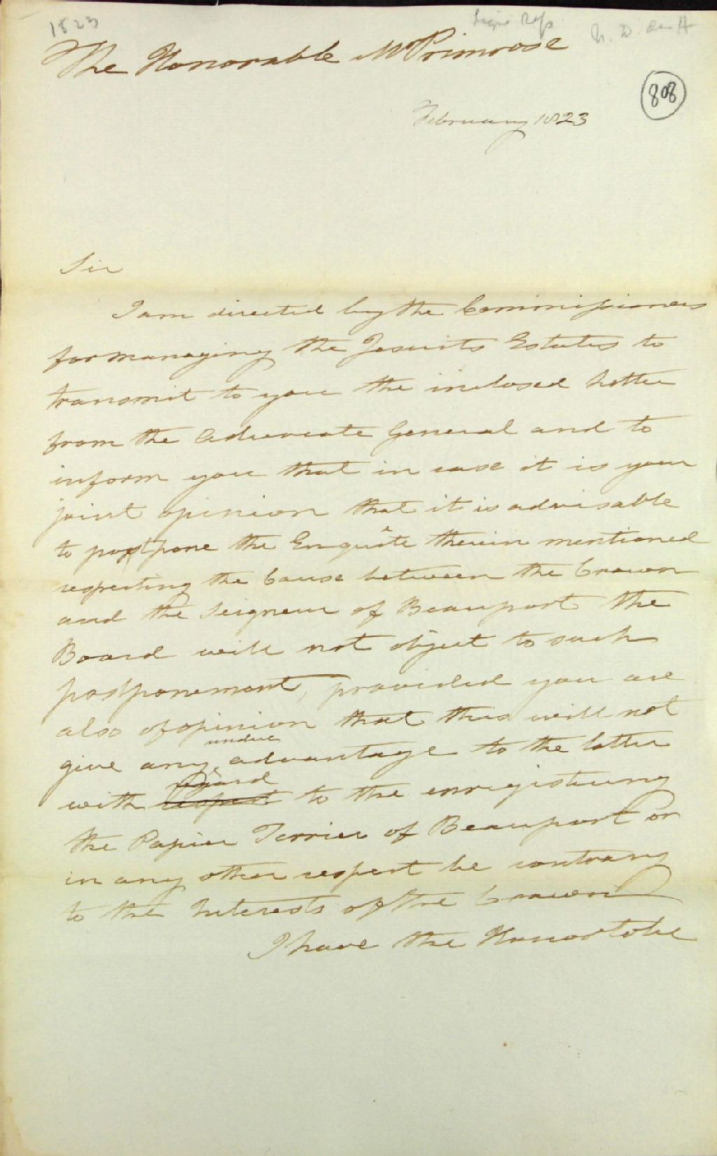 Lettre de la commission responsable de l'administration des biens des Jésuites à Francis Ward Primrose, avocat, et Charles Ogden, écuyer du conseil du Roi, qui présente l'opinion juridique de l'avocat général quant au procès visant à déterminer la limite des seigneuries Notre-Dame-des-Anges et de Beauport, février 1823, Archives nationales à Québec, Fonds Ministère des Terres et Forêts, (03Q,E21,S64,SS5,SSS5,D808).