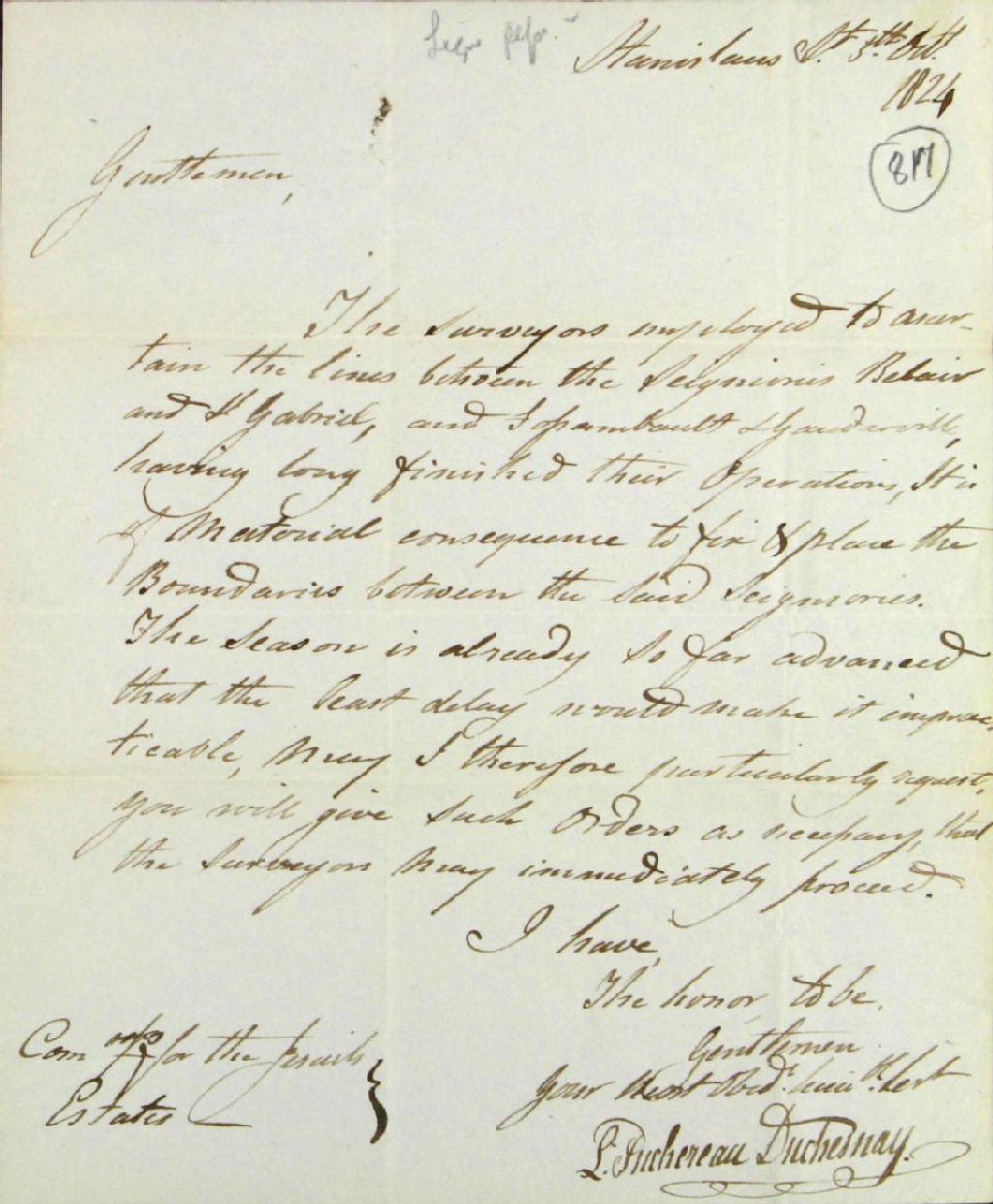Lettre de Louis Juchereau Duchesnay, propriétaire de la seigneurie de Beauport, aux membres de la commission responsable de l'administration des biens des Jésuites concernant l'arpentage de plusieurs seigneuries. Duchesnay mentionne que l'arpentage des lignes de séparation entre les seigneuries Bélair, Saint-Gabriel et Fossambault a été complété, mais que l'arpentage de la ligne de séparation entre les seigneuries Notre-Dame-des-Anges et de Beauport n'a pas encore débuté, 5 octobre 1824, Archives nationales à Québec, Fonds Ministère des Terres et Forêts, (03Q,E21,S64,SS5,SSS5,D817).