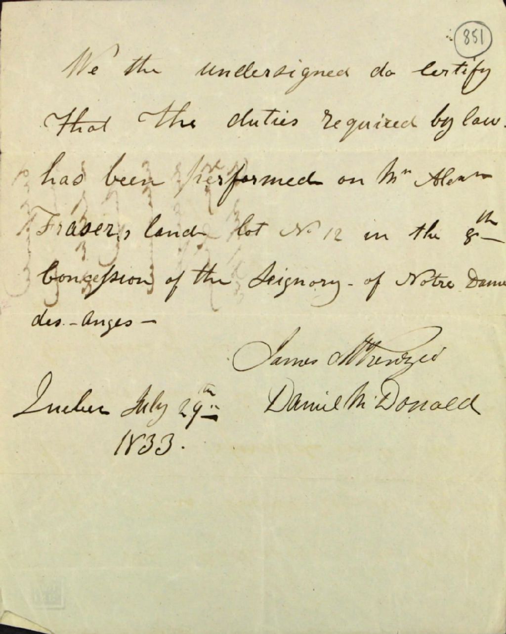 Attestation de Daniel McDonald et James McKenzie (?) selon laquelle les obligations requises par la loi ont été effectuées sur la terre de M. Alex Fraser, lot numéro 12 dans la huitième concession de la seigneurie Notre-Dame-des-Anges, 29 juillet 1833, Archives nationales à Québec, Fonds Ministère des Terres et Forêts, (03Q,E21,S64,SS5,SSS5,D851).