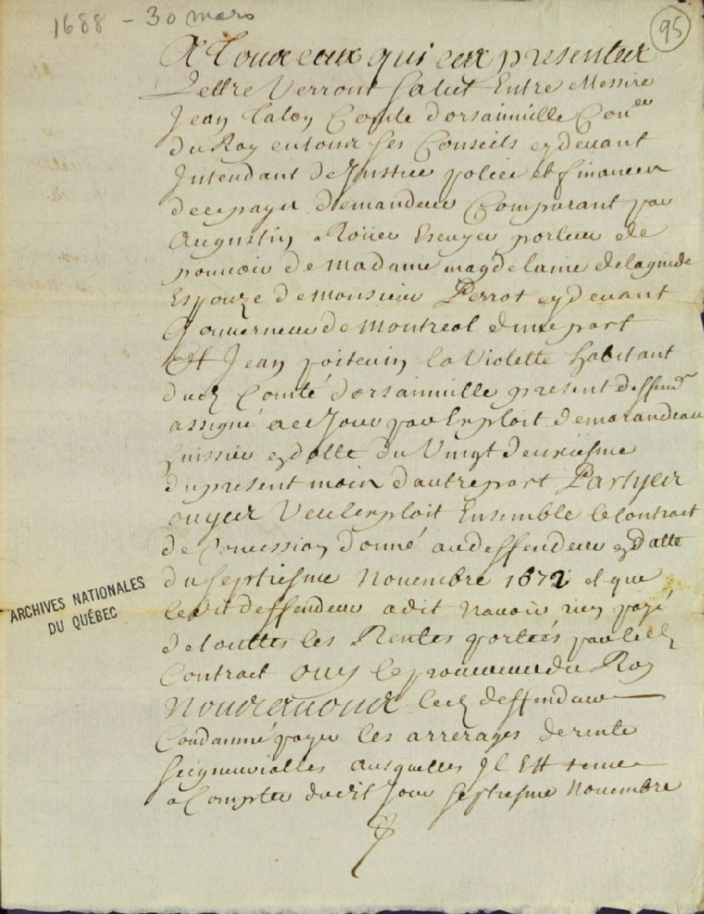 Jugement rendu en faveur de messire Jean Talon, comte d'Orsainville, conseiller du Roi en ses Conseils, ci-devant intendant de justice, police et finances, comparant par Augustin Rouer, écuyer, porteur du pouvoir de dame Madeleine Laguide, épouse de monsieur Perrault (Perrot), ci-devant gouverneur de Montréal, par René-Louis Chartier, écuyer, seigneur de Lotbinière, conseiller du Roi et son lieutenant général civil et criminel au siège de la Prévôté de Québec, dans la cause concernant le non paiement des cens et rente d'une terre l'opposant à Jean Poitevin dit Laviolette, habitant du comté d'Orsainville
