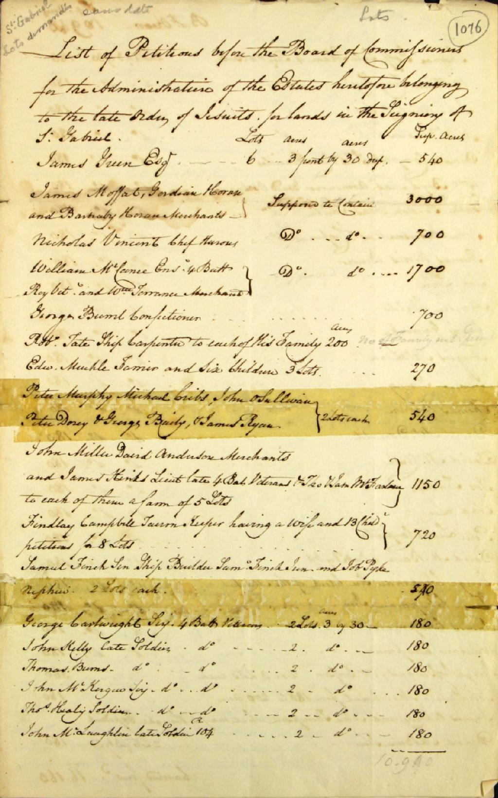 Liste des requêtes soumises à la Commission des biens des Jésuites pour les terres de la seigneurie Saint-Gabriel, comprenant le nom du requérant, le numéro du ou des lots, la superficie et le nombre d'acres demandés, 1647 - 1886, Archives nationales à Québec, Fonds Ministère des Terres et Forêts, (03Q,E21,S64,SS5,SSS6,D1076).