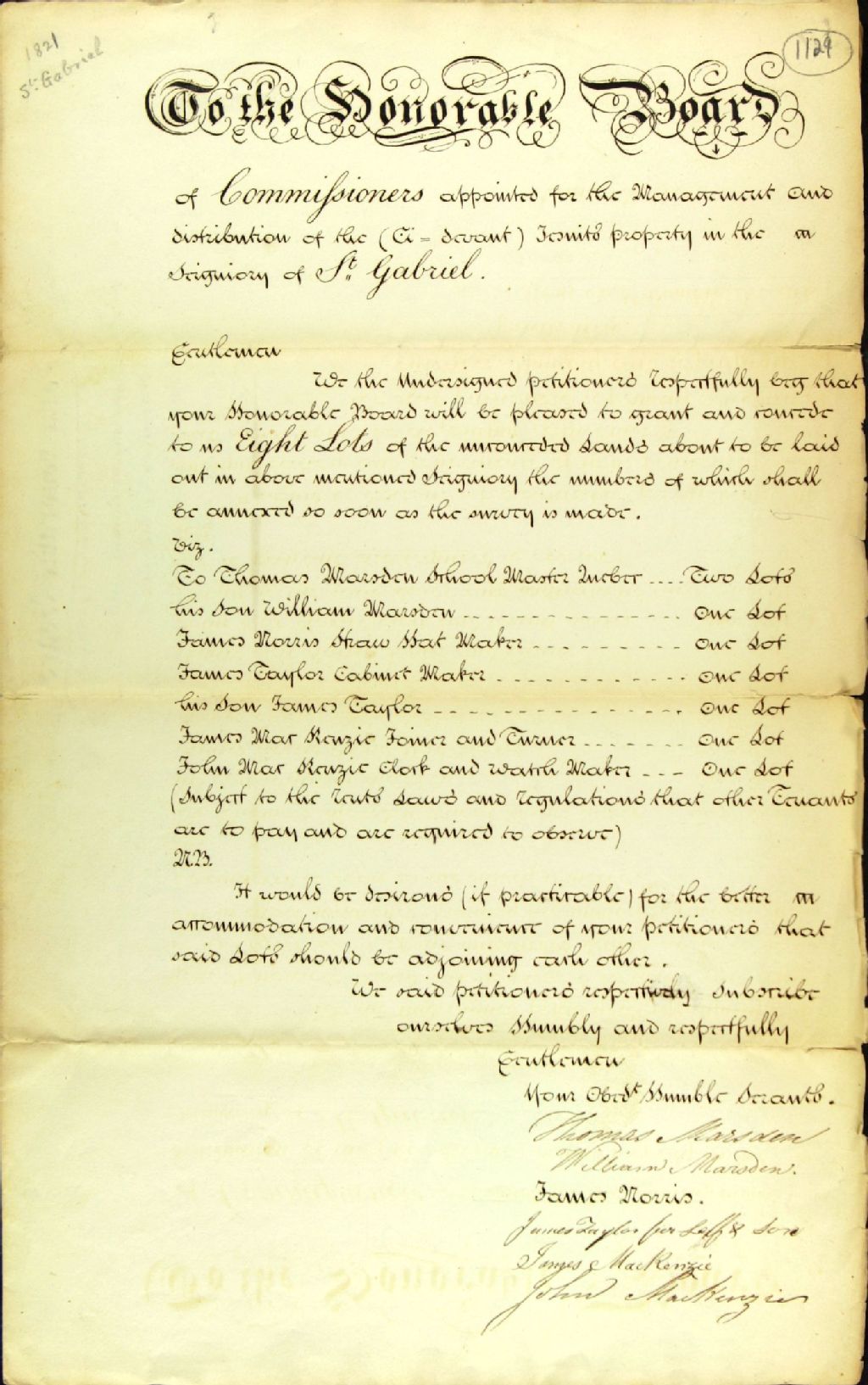 Requête de Thomas Marsden, maître d'école, son fils William Marsden, James Morris, fabricant de chapeaux de paille, James Taylor père, ébéniste, James Tylor fils, James MacKenzie (McKenzie), charpentier et tourneur, John MacKenzie (McKenzie), horloger, adressée à la commission responsable de l'administration des biens des Jésuites, afin de se faire concéder dix lots dans la seigneurie Saint-Gabriel
