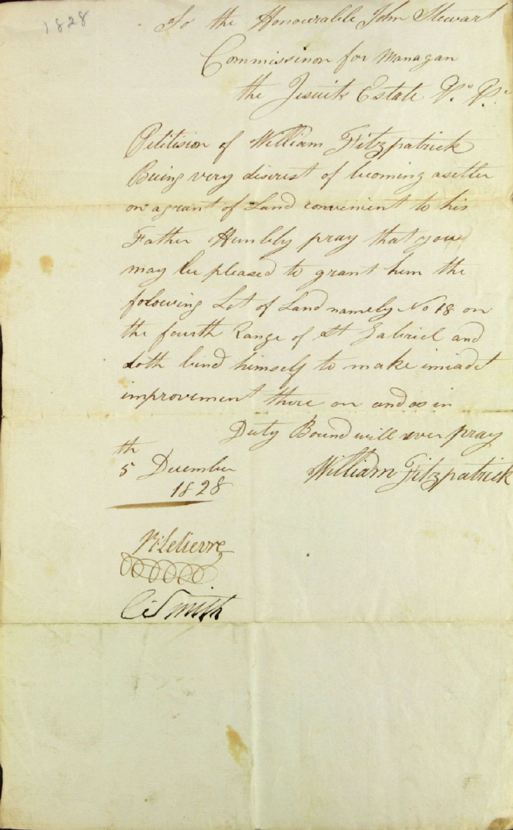 Requête de Thomas Hunter père pour Patrick Liddy, ancien milicien, adressée à John Stewart, gestionnaire (manager) des biens des Jésuites, afin de se faire concéder une terre dans la troisième concession de la seigneurie Saint-Gabriel, et notes de recommandation en faveur du requérant de Michael Louch (?), Anderson, George Chapman, P. MacMahon (McMahon) et Louis Panet, 6 décembre 1828, Archives nationales à Québec, Fonds Ministère des Terres et Forêts, (03Q,E21,S64,SS5,SSS6,D1202).
