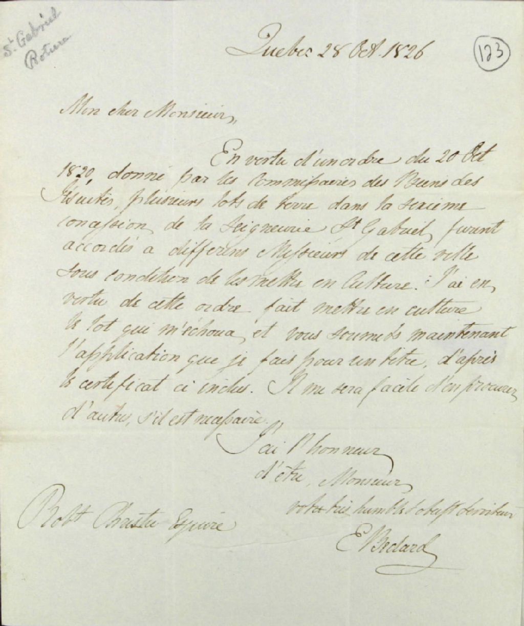 Lettre d'E. Bédard à Robert Christie, écuyer, à l'effet qu'il voudrait avoir le titre de propriété de la terre qu'il a mis en culture dans la sixième concession de la seigneurie de Saint-Gabriel, 28 octobre 1826, Archives nationales à Québec, Fonds Ministère des Terres et Forêts, (03Q,E21,S64,SS5,SSS6,D123).