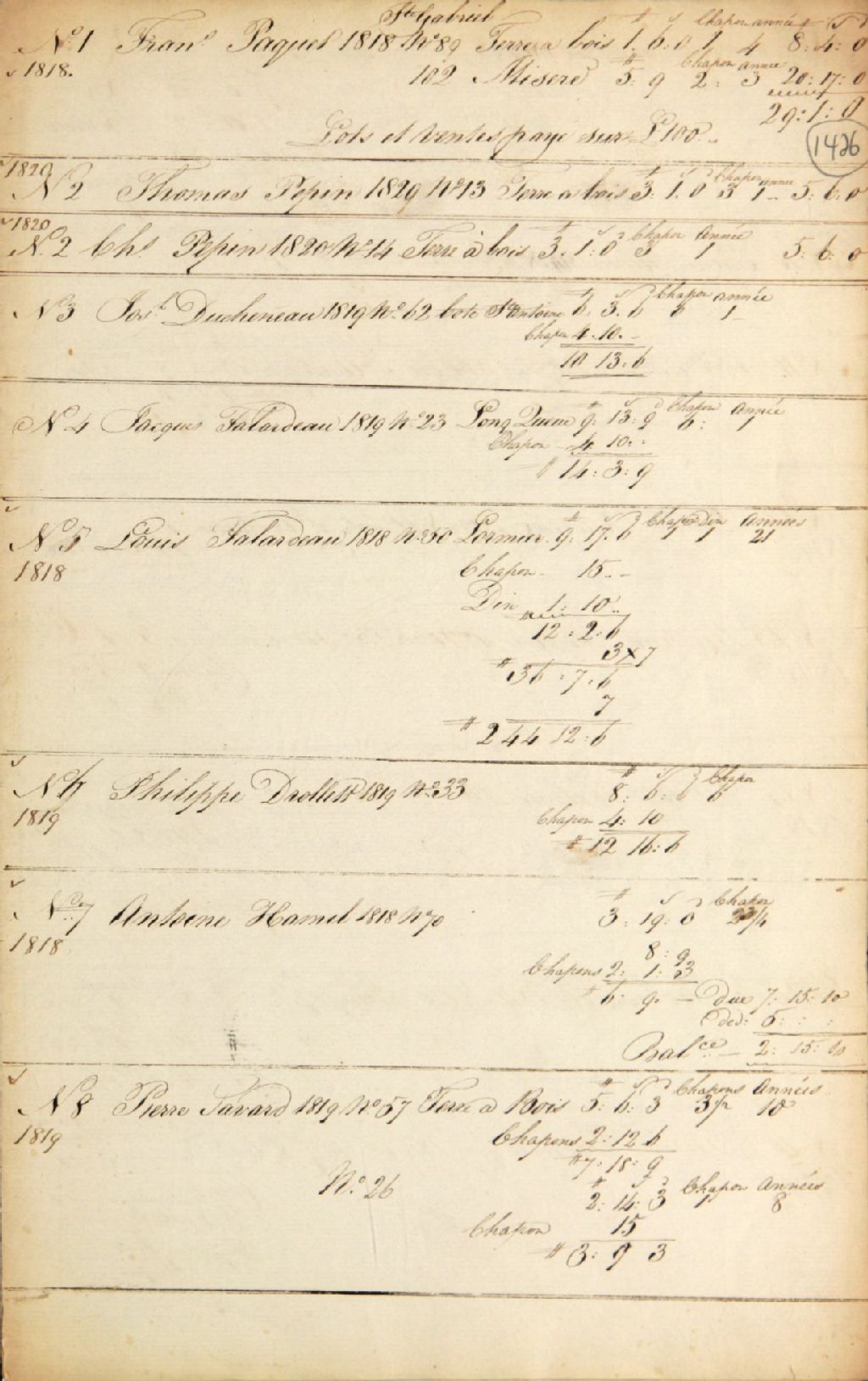 - Le document 1427 concerne plus particulièrement l'Ancienne-Lorette (folios 5 à 7) et la pièce 1428, Valcartier (folios 8 à 13); le cahier 1429 est une liste des concessions accordées par les Révérends Pères Jésuites entre 1671 et 1799 (folios 14 à 17); la pièce 1430 est une liste des censitaires de la seigneurie Saint-Gabriel comprenant le nom des censitaires, leur rente annuelle et leurs arrérages (folios 18 à 33); le document 1431 (folios 34 et 35) concerne Jacques Drolet (Drolette), forgeron; les documents 1432 à 1434 (folios 36 à 41) sont des tableaux des censitaires des premières et deuxièmes concessions situées au nord-ouest de la rivière aux Pins; le cahier 1435 (folios 42 à 53) est une liste des habitants de la seigneurie Saint-Gabriel qui doivent leurs rentes, présentée en ordre alphabétique; la pièce 1436 (folios 54 à 56, sans date) présente les noms des propriétaires actuels des lots au nord-ouest de la rivière aux Pins; la [...]