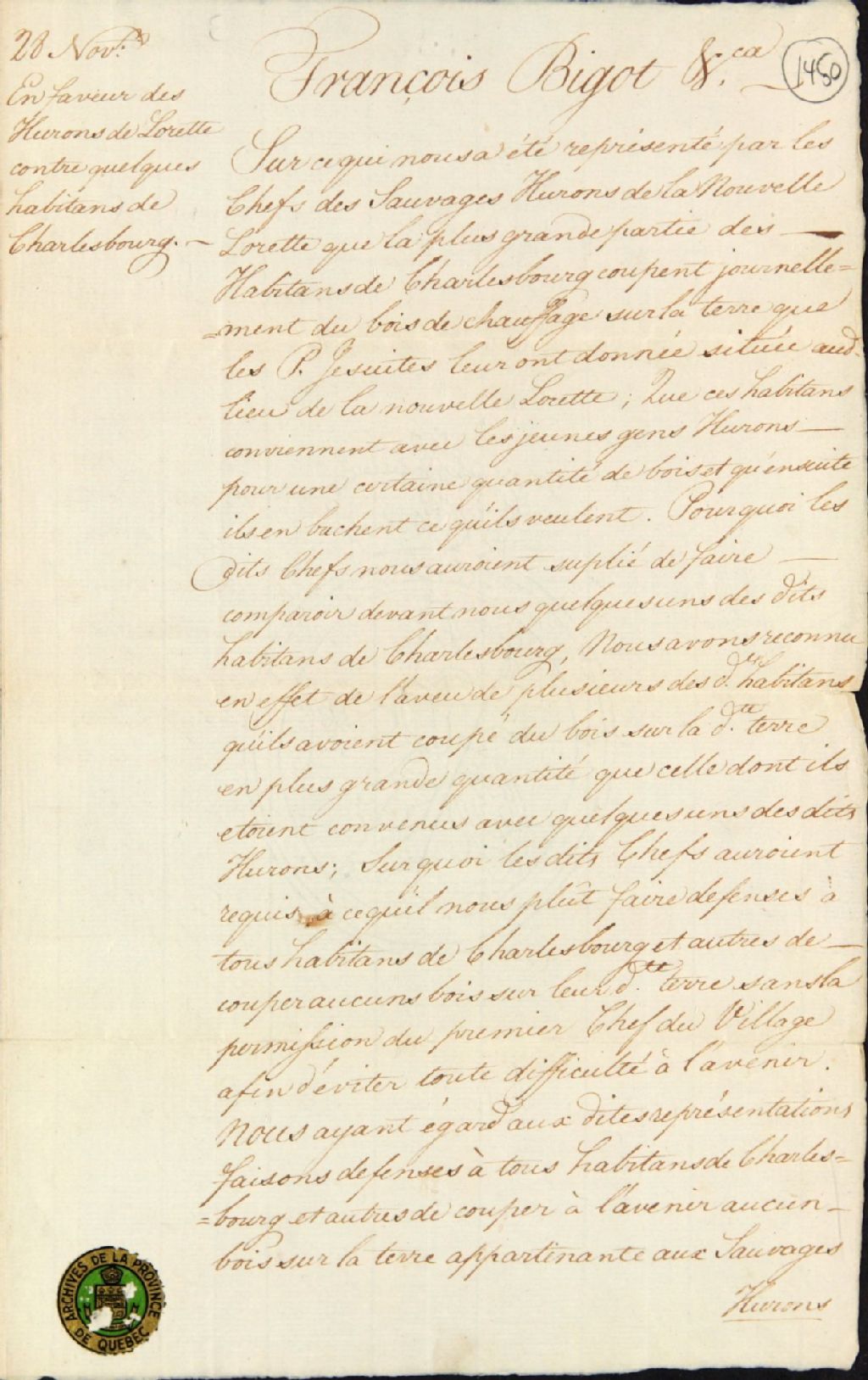 Ordonnance de l'intendant Bigot en faveur des Hurons (Amérindiens) de la Nouvelle-Lorette, contre quelques habitants de Charlesbourg qui allaient bûcher du bois dur le terrain donné aux Hurons par les Jésuites, 28 novembre 1748, Archives nationales à Québec, Fonds Ministère des Terres et Forêts, (03Q,E21,S64,SS5,SSS6,D1450).