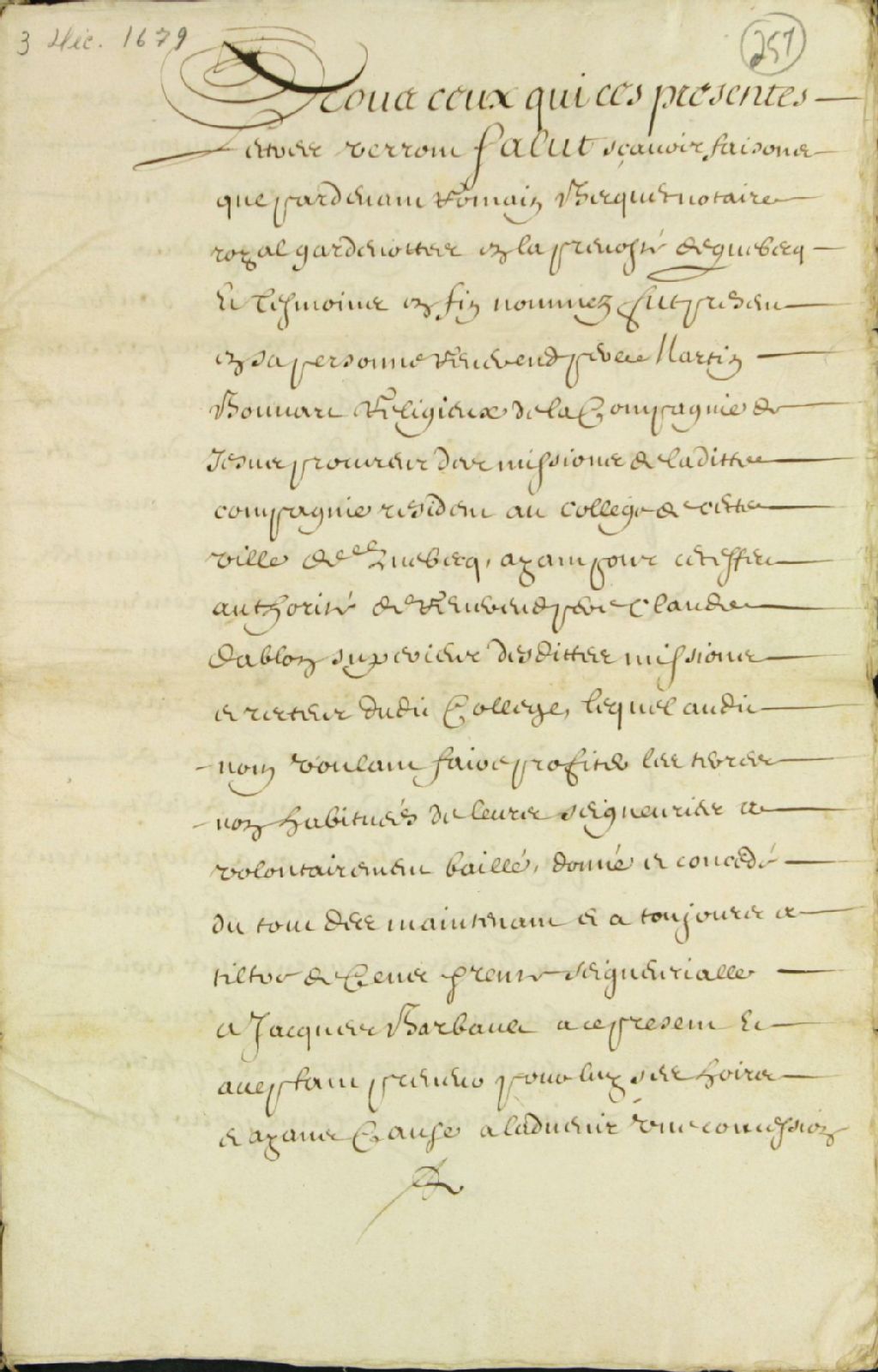 Acte de concession d'une terre située à la côte Saint-Antoine dans la seigneurie Saint-Gabriel par les Révérends Pères Jésuites à Jacques Barbeau (Barbault), par-devant Romain Becquet, notaire royal garde-notes