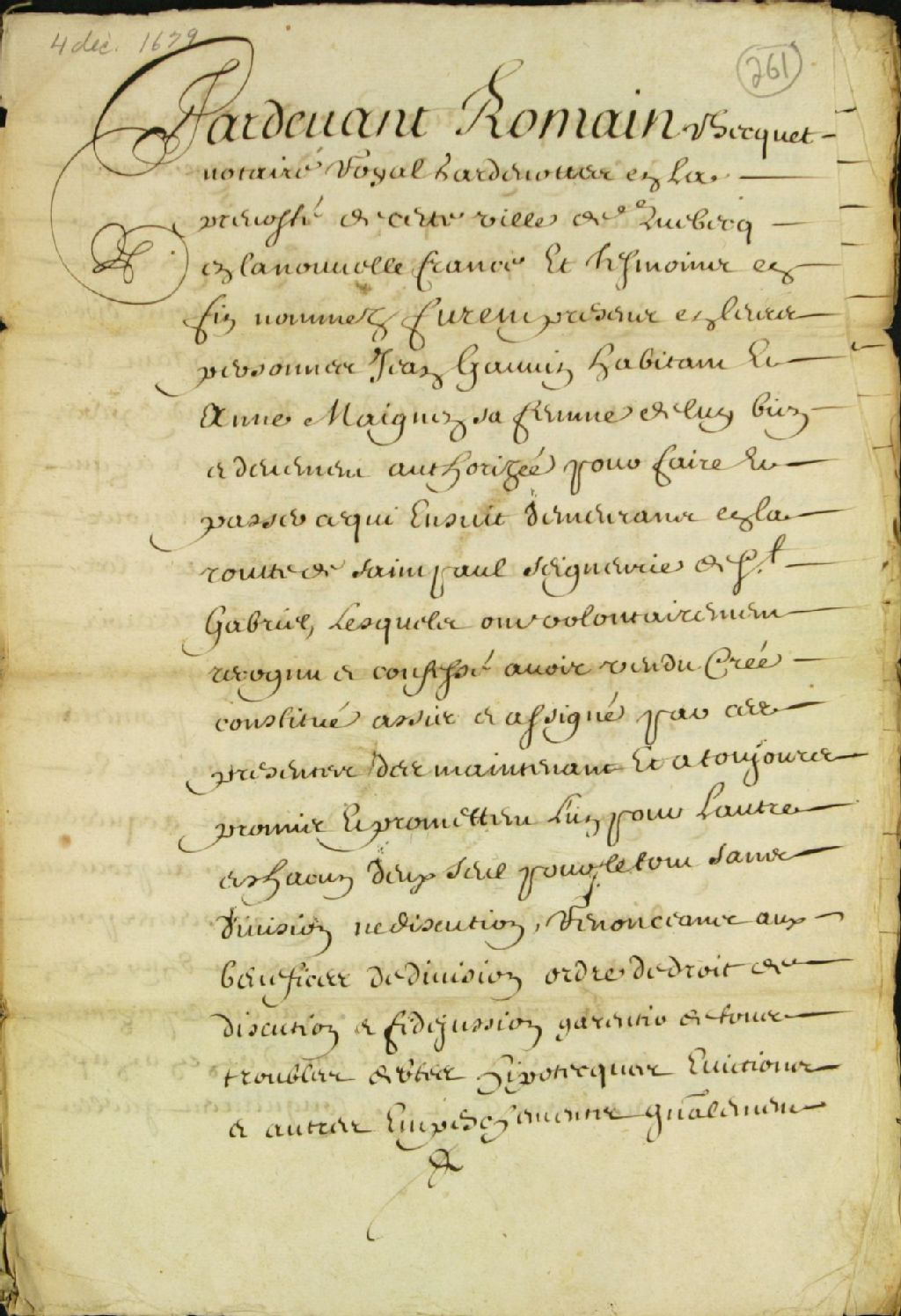 Constitution de rente (rente constituée) par Jean Gauvin et sa femme Anne Magnan, sur leur terre située à la route Saint-Paul dans la seigneurie Saint-Gabriel, en faveur des Révérends Pères Jésuites, par-devant Romain Becquet, notaire royal garde-notes, 4 novembre 1679, Archives nationales à Québec, Fonds Ministère des Terres et Forêts, (03Q,E21,S64,SS5,SSS6,D261).