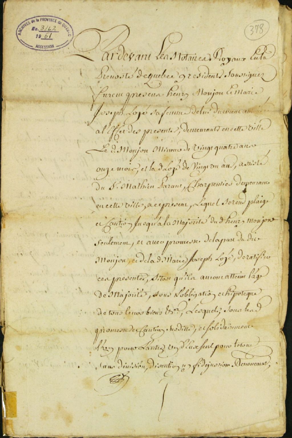 - Acte de vente d'une terre située à la côte Saint-Antoine dans la paroisse de Charlesbourg, par Henri Mongeon (Monjou) et sa femme Marie-Josèphe Lauzé (Lozé), mineurs, à Pierre Bernard, meunier à la Jeune-Lorette, paroisse de Charlesbourg, qu'il acquiert au nom de son fils mineur Pierre Bernard, meunier à Saint-Augustin dans la seigneurie de Demaure (Desmaures), et sa femme Marie-Josèphe Pageot (Pajot), par-devant Gilbert Boucault de Godefus, notaire royal, et autres actes liés à cette terre