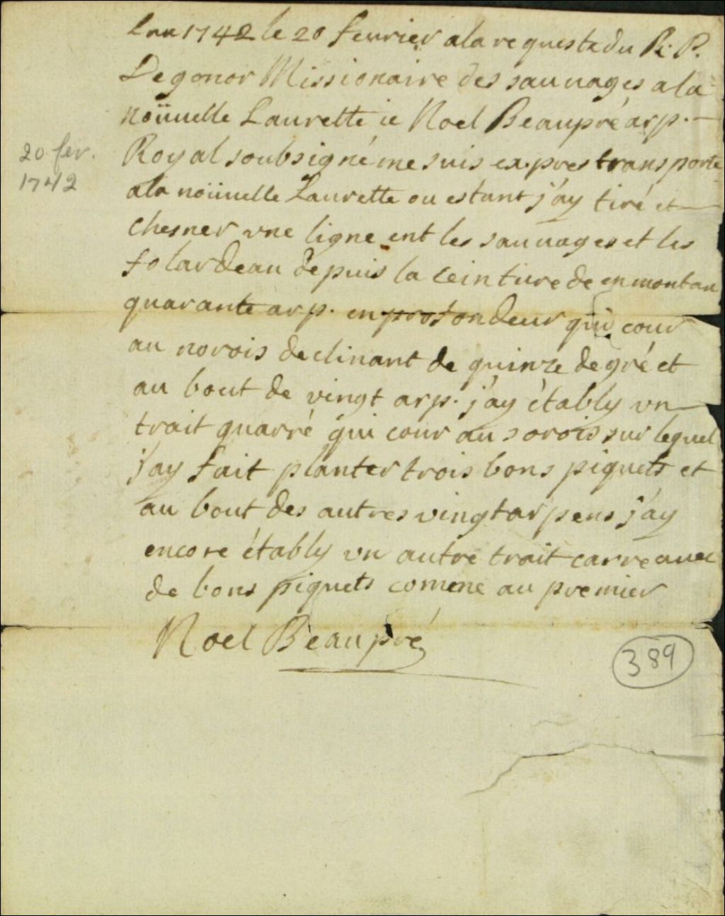 Procès-verbal d'arpentage du terrain (trait-quarré) des Sauvages [Amérindiens, Hurons de la seigneurie Saint-Gabriel] effectué par Noël Beaupré, arpenteur royal, à la requête du Révérend Père Degonor (Desgonor), missionnaire des Sauvages à la Nouvelle-Lorette (Jeune-Lorette), 20 février 1742, Archives nationales à Québec, Fonds Ministère des Terres et Forêts, (03Q,E21,S64,SS5,SSS6,D389).