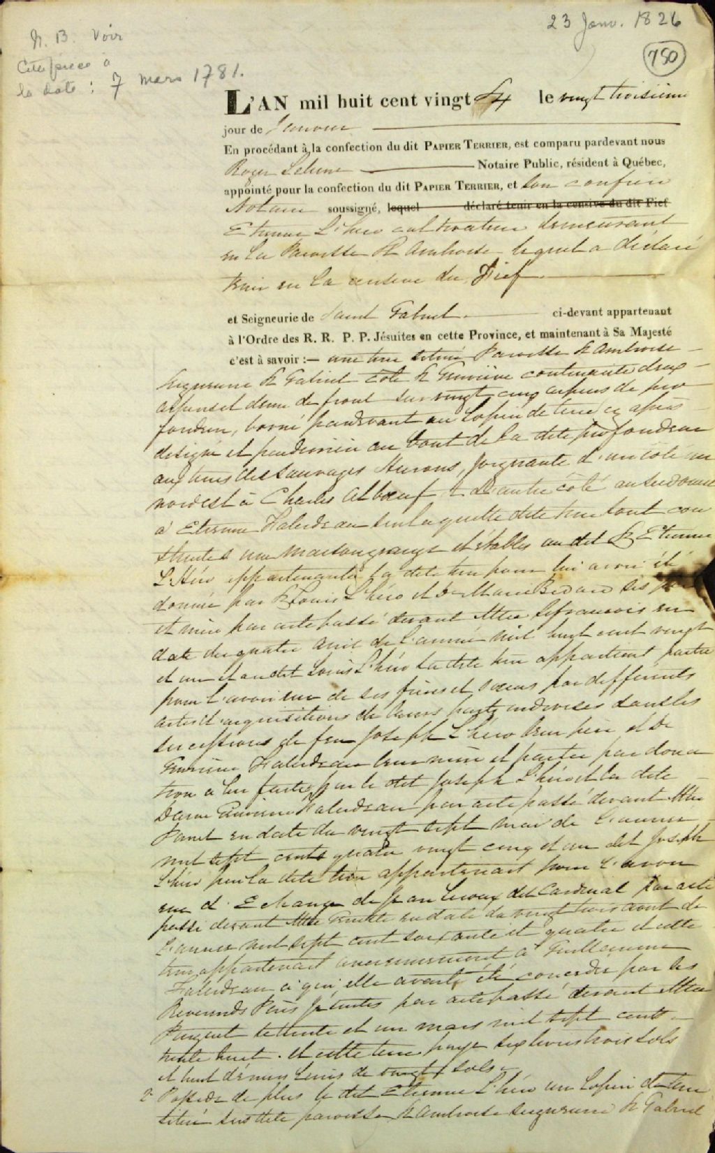 Déclaration de possession de terre (titre nouvel) en vue de confectionner le papier terrier du fief et seigneurie Saint-Gabriel, de Étienne Lereau (L'Héro), cultivateur de Saint-Ambroise, pour des terres situées à la côte Sainte-Geneviève, à la montagne Ronde et à la côte Saint-Gabriel, par-devant Roger Lelièvre et Robert Christie, notaires publics, 23 janvier 1826, Archives nationales à Québec, Fonds Ministère des Terres et Forêts, (03Q,E21,S64,SS5,SSS6,D750).