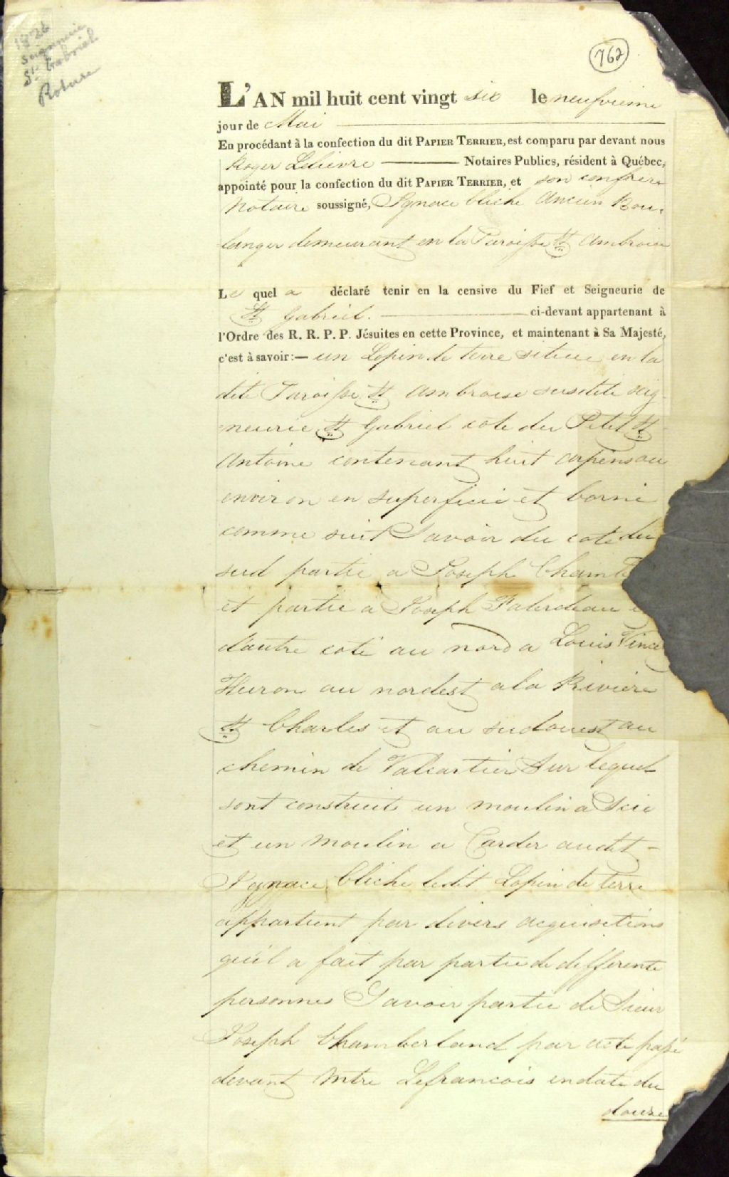 Déclaration de possession de terre (titre nouvel) en vue de confectionner le papier terrier du fief et seigneurie Saint-Gabriel, d'Ignace Cliche, ancien boulanger de Saint-Ambroise, pour une terre située à la côte du Petit Saint-Antoine, par-devant Roger Lelièvre et Robert Christie, notaires publics, 9 mai 1826, Archives nationales à Québec, Fonds Ministère des Terres et Forêts, (03Q,E21,S64,SS5,SSS6,D762).
