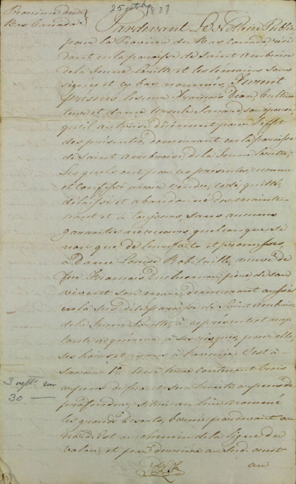 - Acte de vente de trois terres situées aux Grands Déserts, le long du chemin qui conduit à Valcartier, et donnant au chemin du Roi, dans la seigneurie Saint-Gabriel, par François Dion, cultivateur de Saint-Ambroise de la Jeune-Lorette, et son épouse Ursule Savard, à Louise Robitaille, veuve de François Duchesneau père, demeurant au même endroit, et quittance du vendeur en faveur de l'acheteuse en date du 26 octobre 1837, par-devant Dominique Lefrançois, notaire public