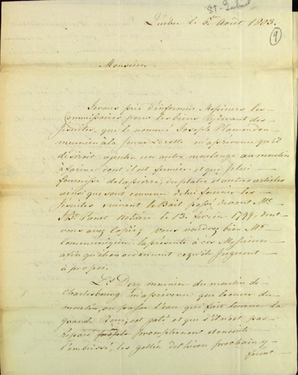 Lettre de Michel Berthelot, écuyer et agent des biens des Jésuites, à George Pyke, secrétaire à la Commission des biens des Jésuites, à l'effet que Joseph Plamondon, meunier à la Jeune-Lorette, désire une autre moulange, que Louis Déry, meunier à Charlesbourg, désire faire réparer un mur du moulin et que John Lynd désire faire soustraire le montant des réparations faites à la ferme du domaine de Sillery aux cens et rentes à acquitter, 5 août 1803, Archives nationales à Québec, Fonds Ministère des Terres et Forêts, (03Q,E21,S64,SS5,SSS6,D9).