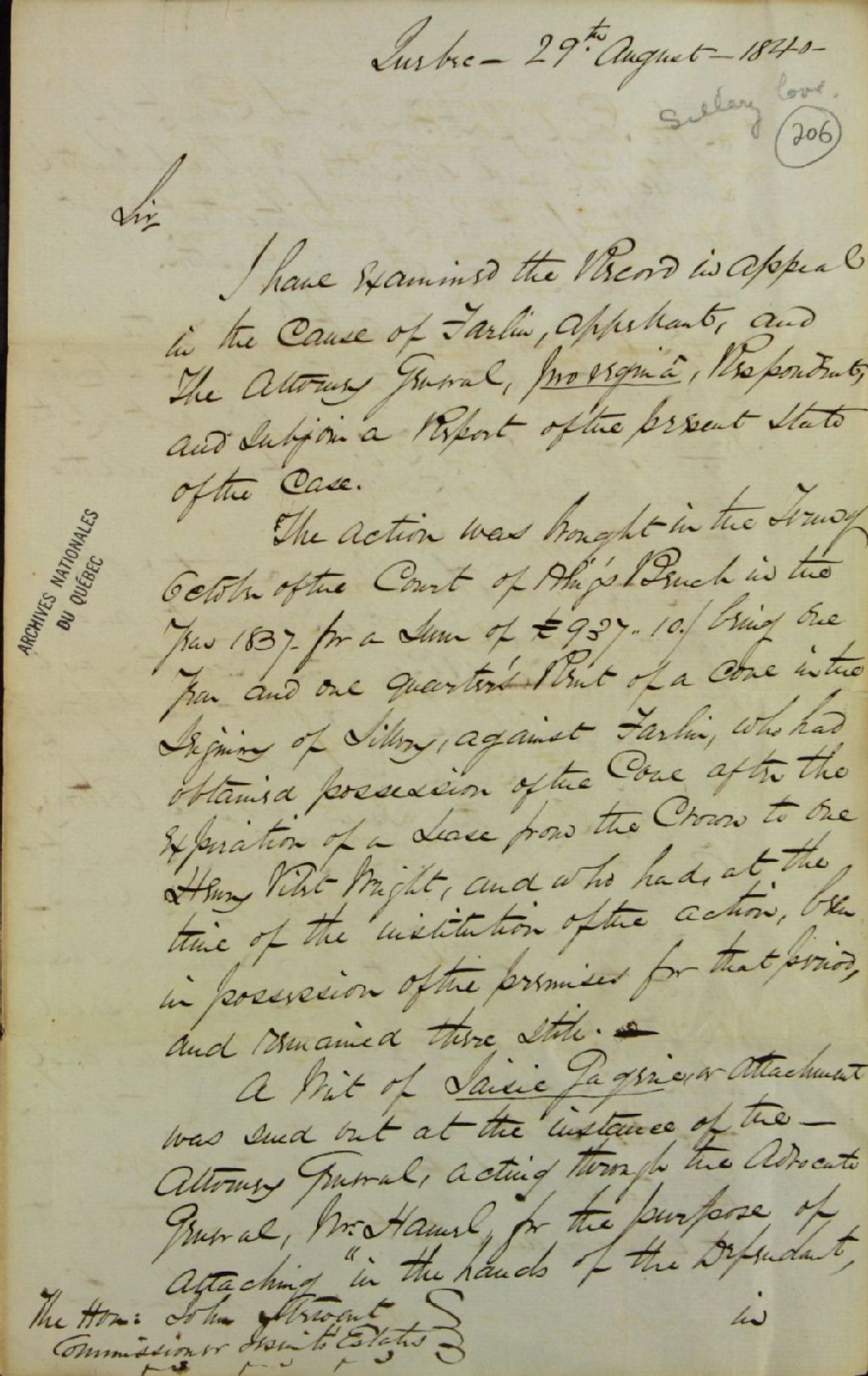 - Rapport James Green adressé à John Stewart, commissaire des biens des Jésuites, concernant l'état actuel de la cause mettant aux prises la Couronne contre Farlin, concernant le droit de propriété d'une anse située dans la seigneurie de Sillery