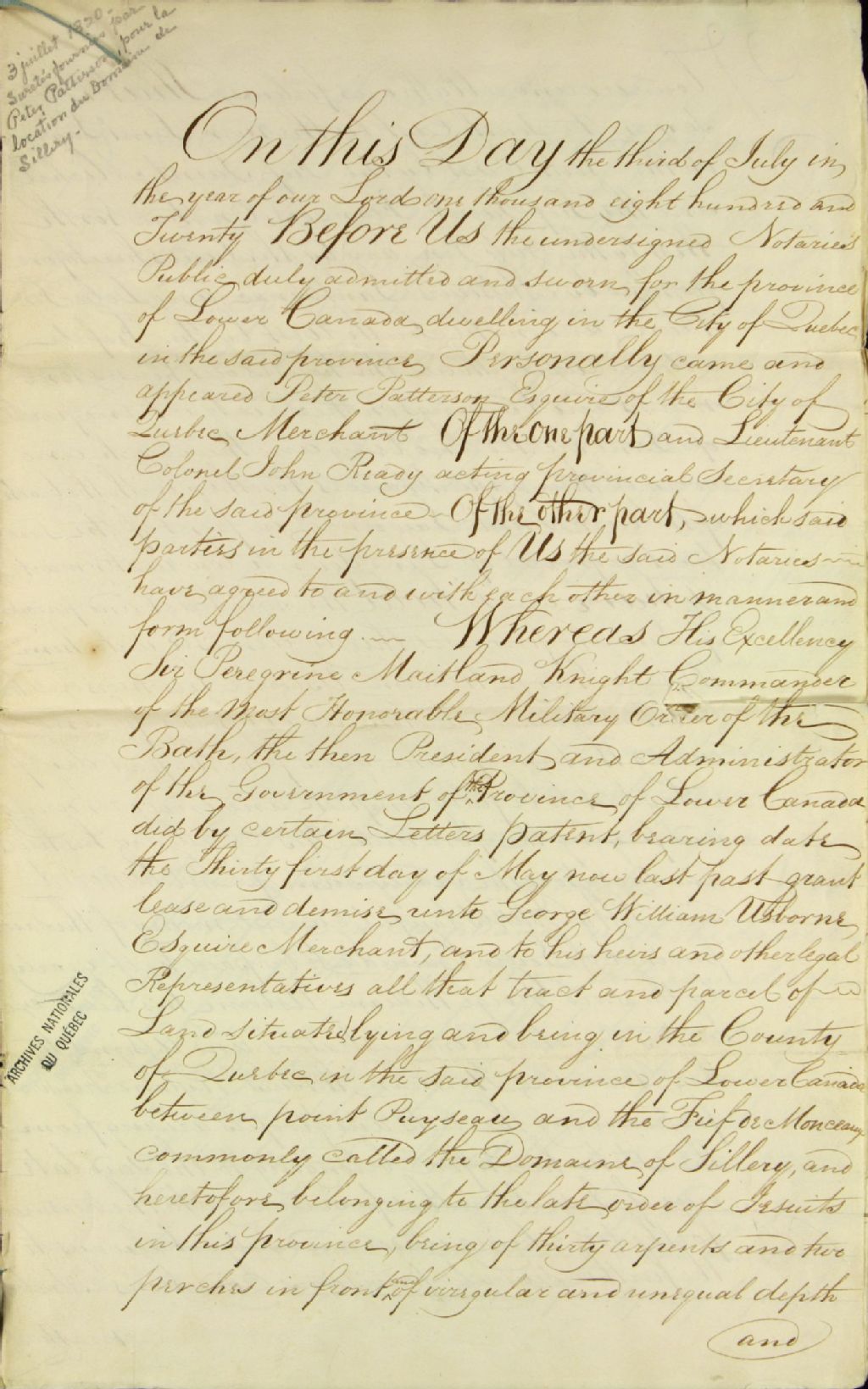 Caution de Peter Patterson, écuyer et manchand de Québec, en faveur de George William Usborne, écuyer et marchand, pour satisfaire les conditions stipulées dans les lettres patentes de location du domaine de Sillery, par-devant Archibald Campbell, notaire public, 3 juillet 1820, Archives nationales à Québec, Fonds Ministère des Terres et Forêts, (03Q,E21,S64,SS5,SSS7,D270).