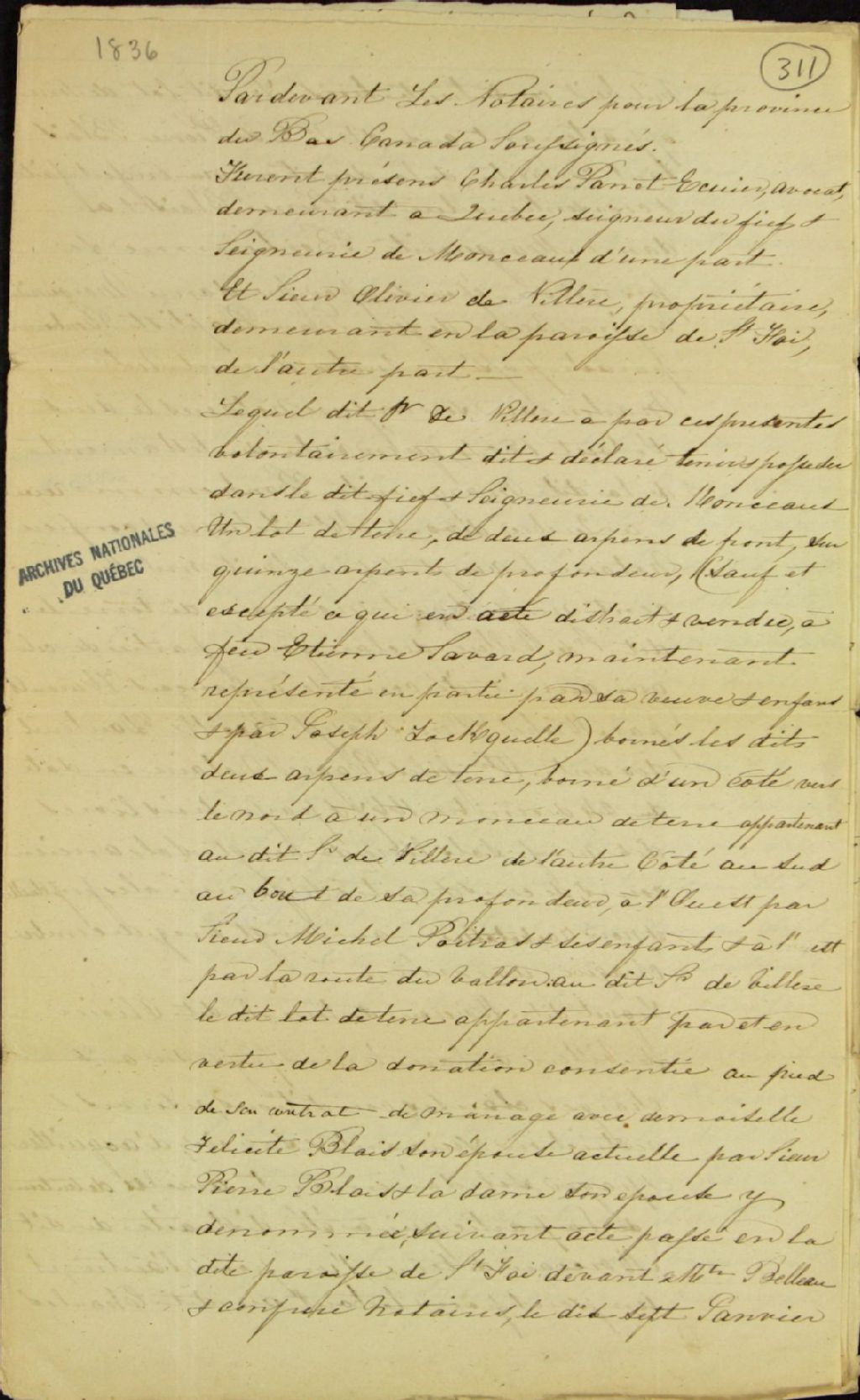 - Titre nouvel d'Olivier de Villère, propriétaire demeurant en la paroisse de Sainte-Foy, pour une terre située dans le fief de Monceaux, accordé par Charles Panet, écuyer et avocat demeurant à Québec, seigneur du fief et seigneurie de Monceaux, par-devant René-Gabriel Belleau, notaire, et deux copies de reçu de paiement faits par Villère à Panet