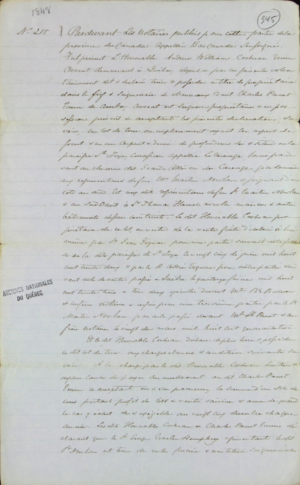 Titre nouvel d'Andrew William Cochran (Cochrane), écuyer et avocat demeurant à Québec, pour une terre située à la concession appellée Carouge à Sainte-Foy, accordé par Charles Panet, écuyer et avocat demeurant à Québec, seigneur du fief et seigneurie de Monceaux, par-devant René-Gabriel Belleau, notaire, 27 juin 1848, Archives nationales à Québec, Fonds Ministère des Terres et Forêts, (03Q,E21,S64,SS5,SSS7,D345).