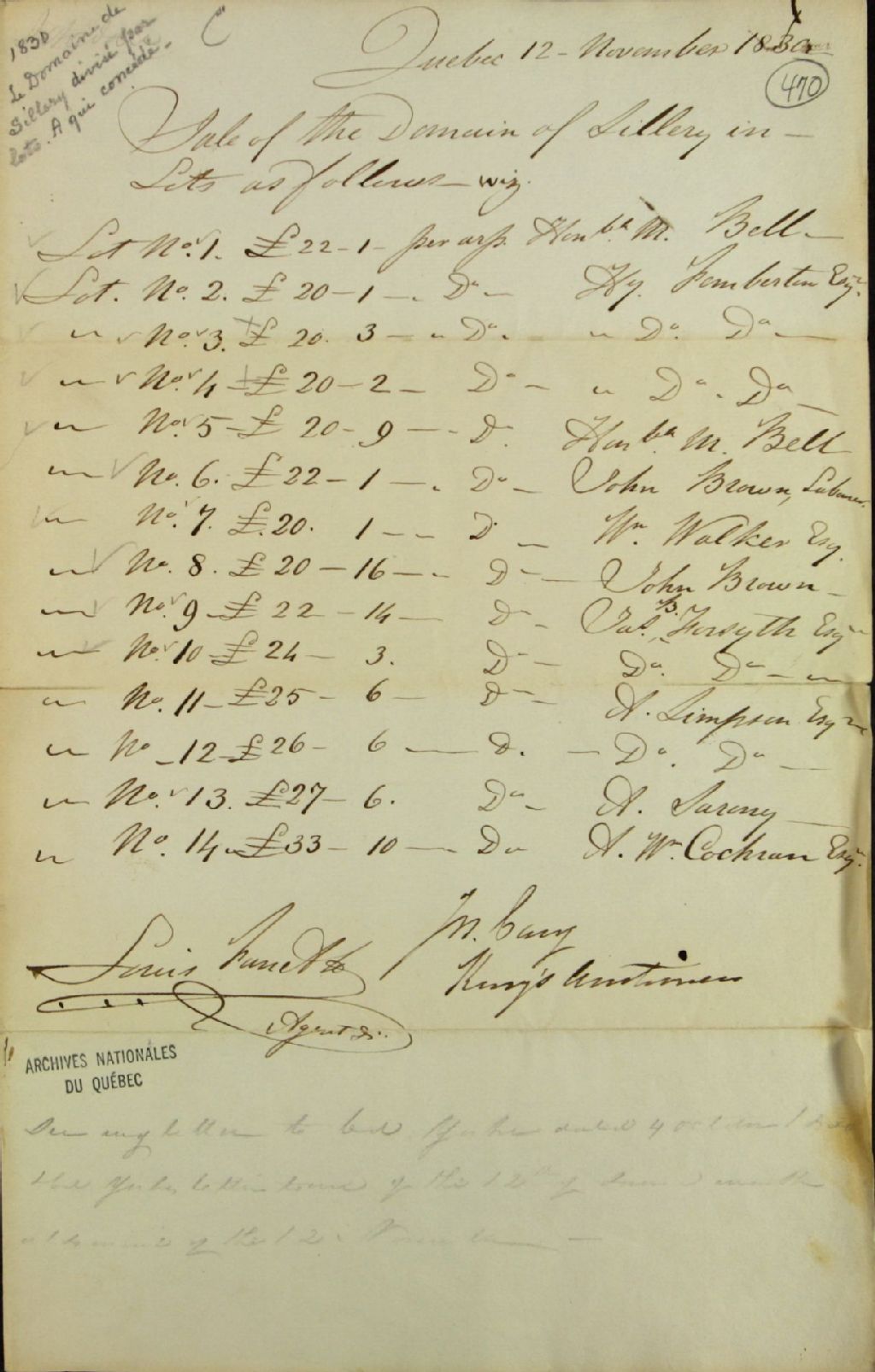 Liste relative à la vente de lots au domaine de Sillery, comprenant le numéro de lot, le prix payé et le nom de l'acheteur, signé Louis Panet, agent, et Gary, encanteur du roi, 12 novembre 1830, Archives nationales à Québec, Fonds Ministère des Terres et Forêts, (03Q,E21,S64,SS5,SSS7,D470).