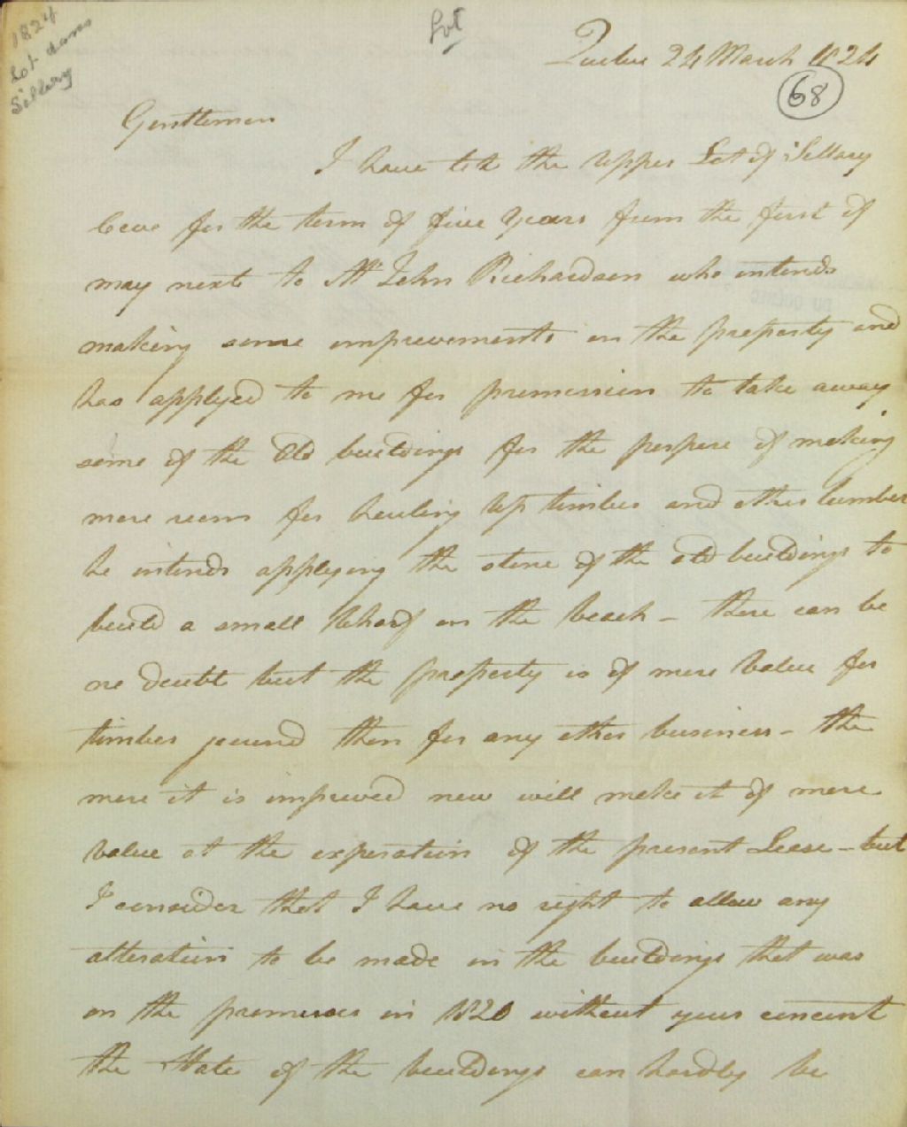Lettre de Peter Patterson aux commissaires des biens des Jésuites, demandant de pouvoir effectuer des travaux sur des bâtiments de la ferme de Sillery, 24 mars 1824, Archives nationales à Québec, Fonds Ministère des Terres et Forêts, (03Q,E21,S64,SS5,SSS7,D68).