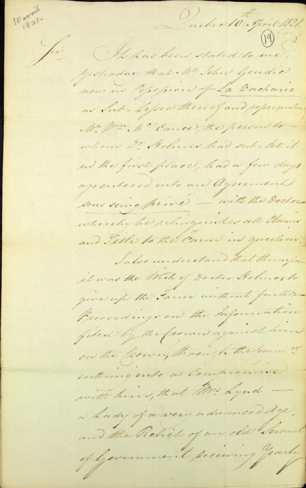 Lettre de George Vanfelson, procureur général du Bas-Canada, à Lewis Foy, inspecteur visiteur des biens des Jésuites, de la ville de Québec, au sujet du bail du domaine de la Vacherie accordé en sous-location à John Goudie