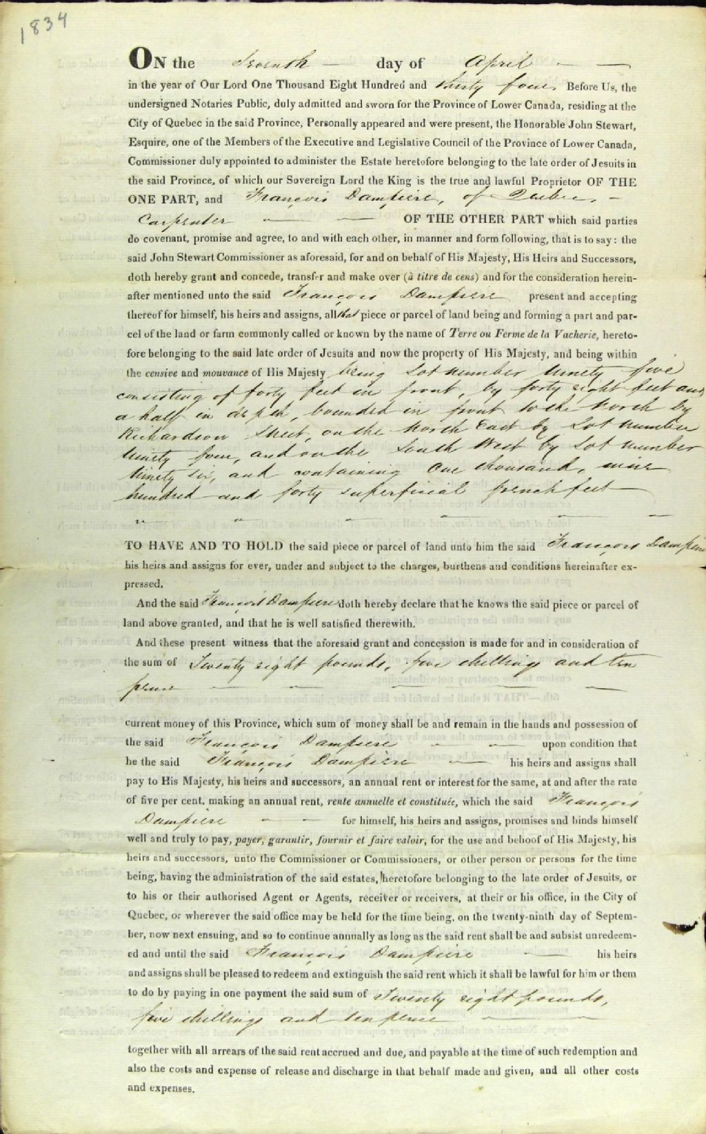 Concession d'une pièce de terre située dans la ferme nommée la Vacherie ; par John Stewart, un des membres des conseils exécutif et législatif de la province du Bas-Canada et commissaire des biens des Jésuites, à François Dompierre, charpentier, de la ville de Québec
