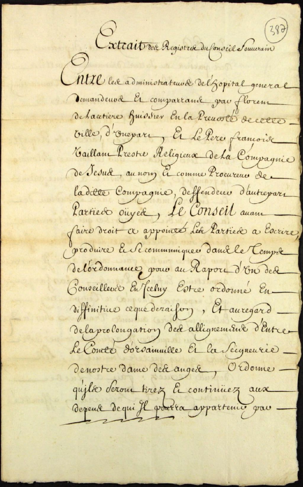 Arrêt du Conseil souverain qui appointe les administrateurs de l'Hôpital général et les Pères Jésuites à écrire et à se communiquer leurs réclamations concernant les bornes de La Vacherie