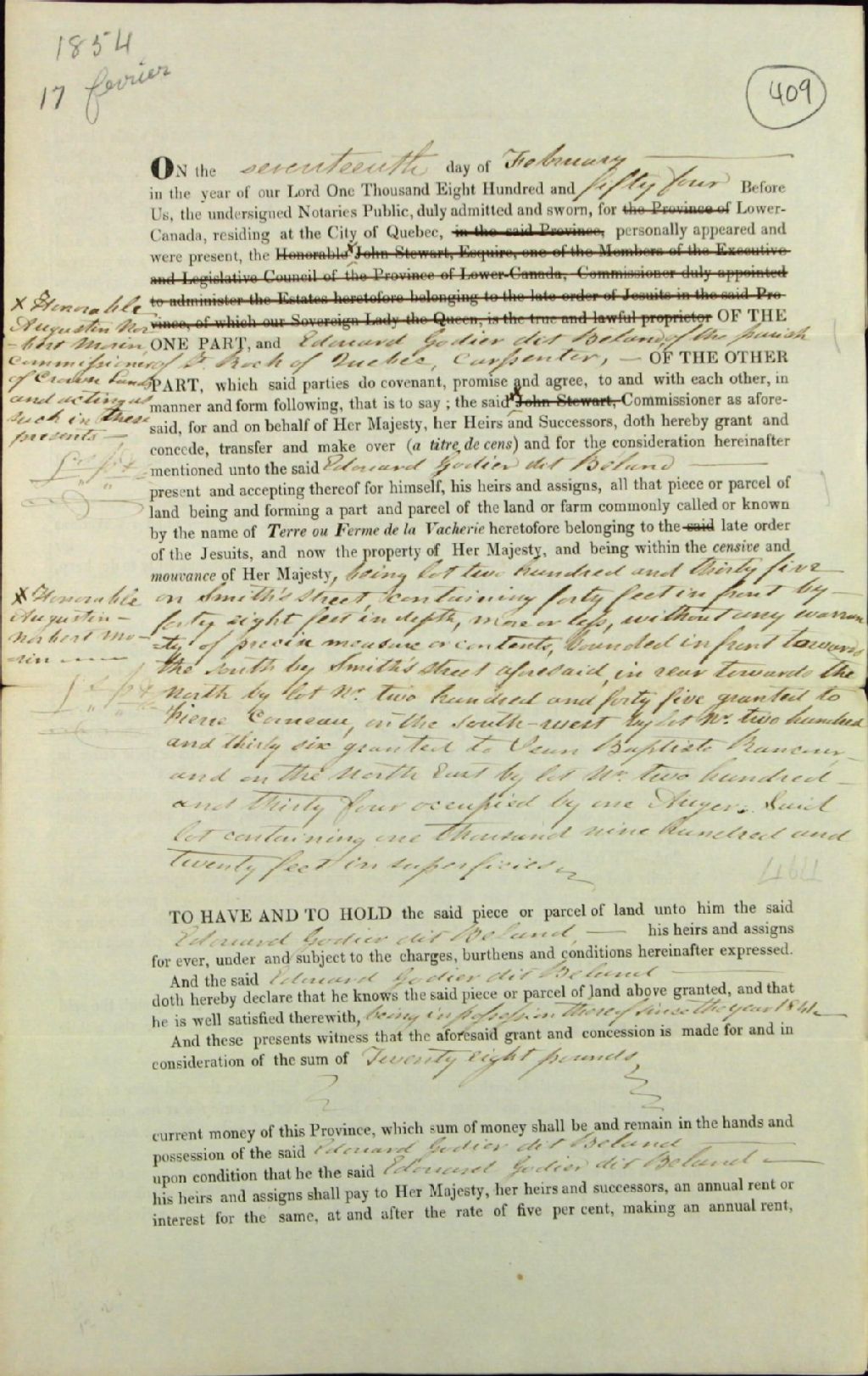 - Concession de terre à La Vacherie par l'honorable Augustin Norbert Morin, commissaire des Terres de la Couronne, à Edward Godier dit Béland, charpentier, du faubourg Saint-Roch