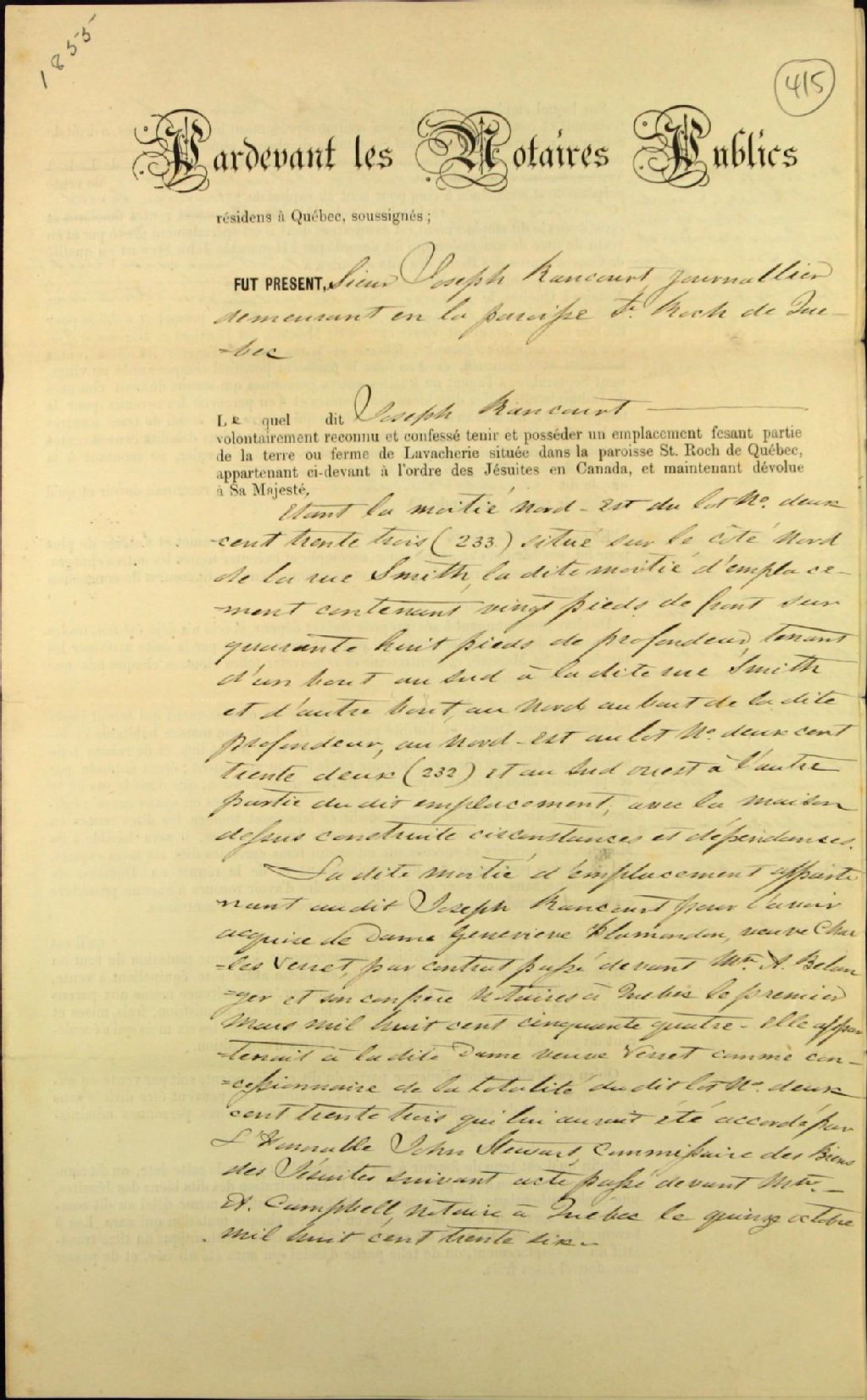 - Titre-nouvel de terre à La Vacherie par-devant les Notaires Publics, résidents à Québec, soussignés, à Joseph Rancourt, journalier, demeurant en la paroisse Saint-Roch