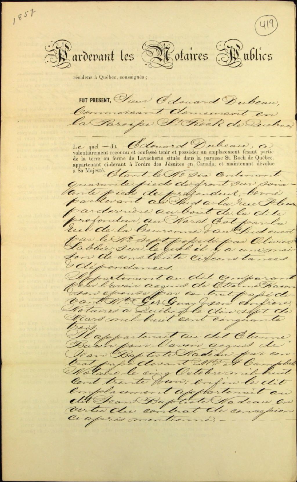 - Titre-nouvel de terre à La Vacherie par-devant les Notaires Publics, résidents à Québec, soussignés, à Edouard Dubeau, commerçant, demeurant en la paroisse Saint-Roch